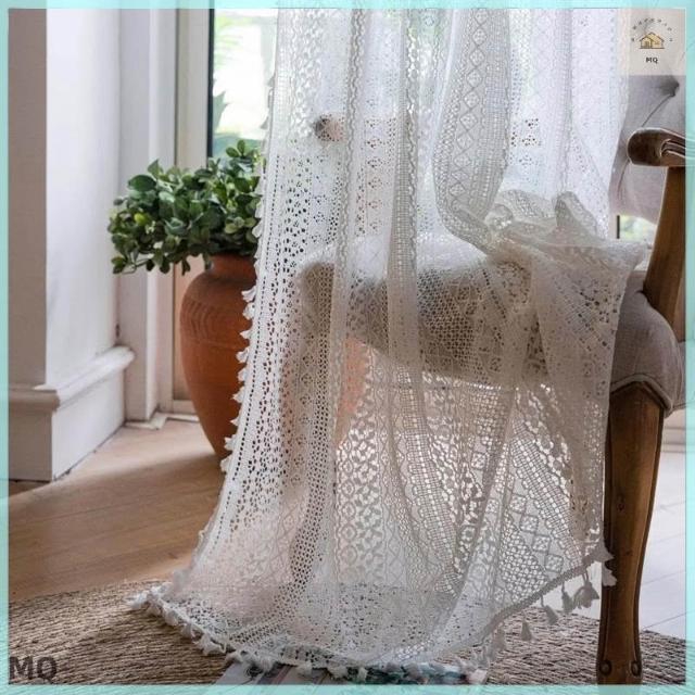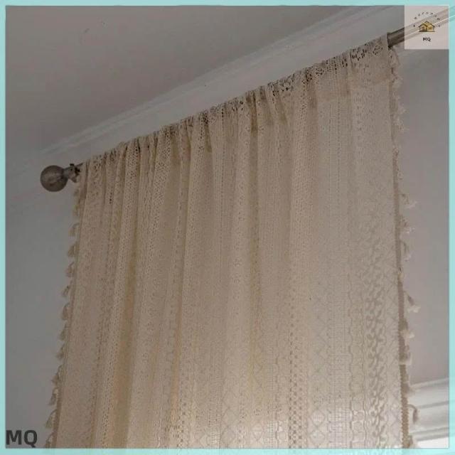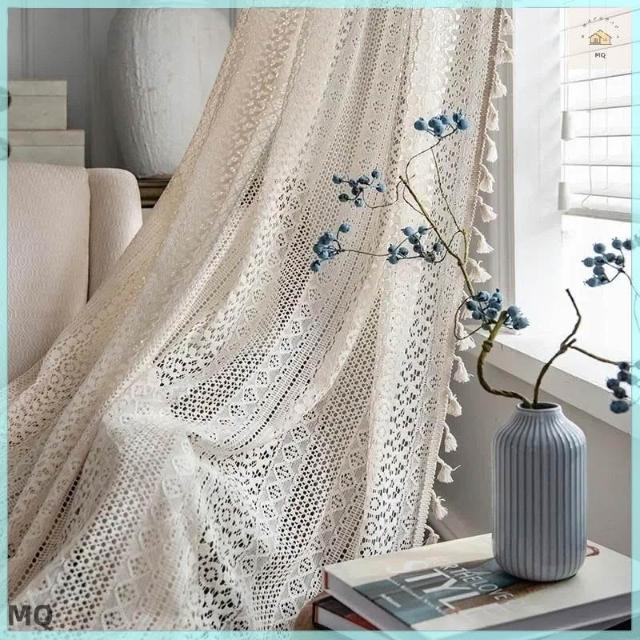 附發票波西米亞風流蘇客廳鉤針窗簾,復古桿口袋窗簾幾何條紋針織蕾絲濾光窗簾