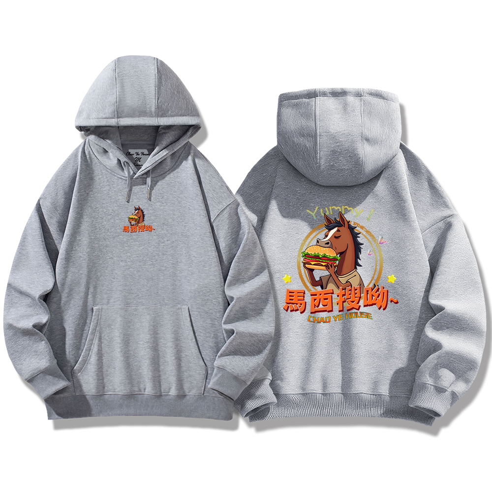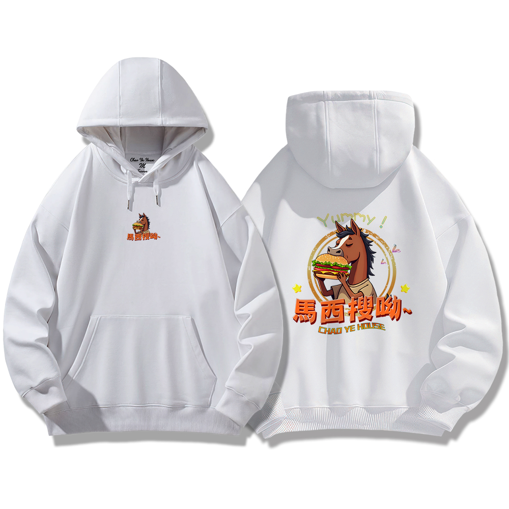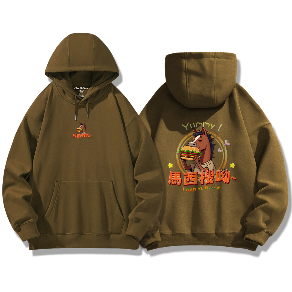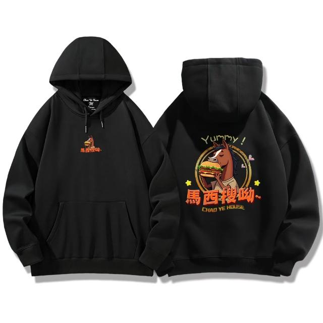 潮野屋馬西搜呦 韓語 好吃 漢堡 馬 帽T 刷毛 長袖上衣 文字風 街頭穿搭 潮流服飾 WDD-1300