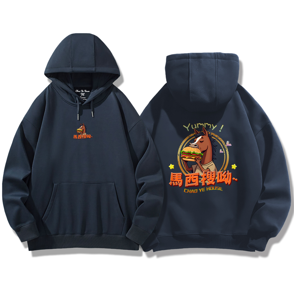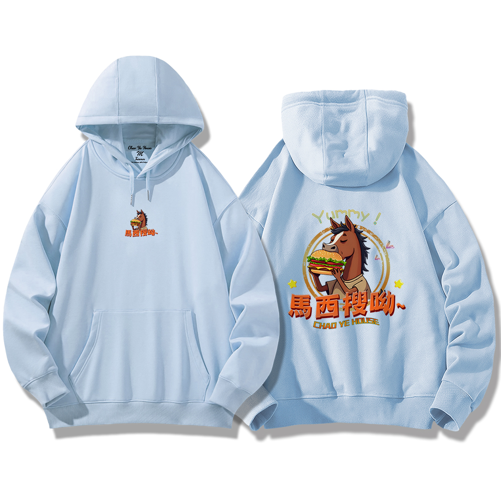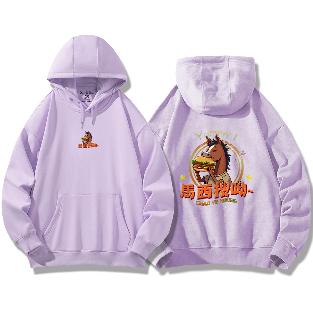 潮野屋馬西搜呦 韓語 好吃 漢堡 馬 帽T 刷毛 長袖上衣 文字風 街頭穿搭 潮流服飾 WDD-1300