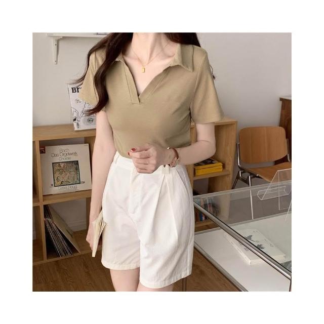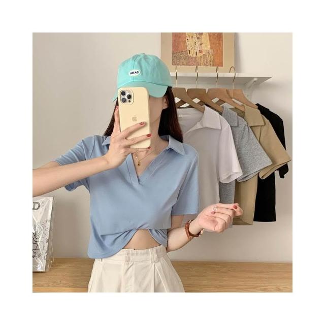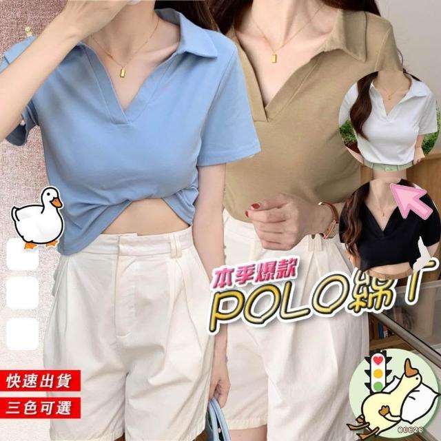 現貨不用等🈶含棉 Polo短袖 t卹 女夏 韓版 修身 V領 純色 短款 正肩 打底衫 女士 上衣服