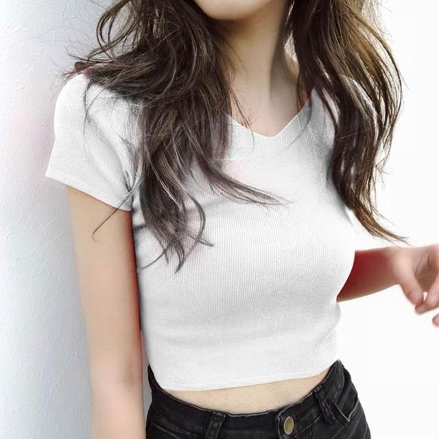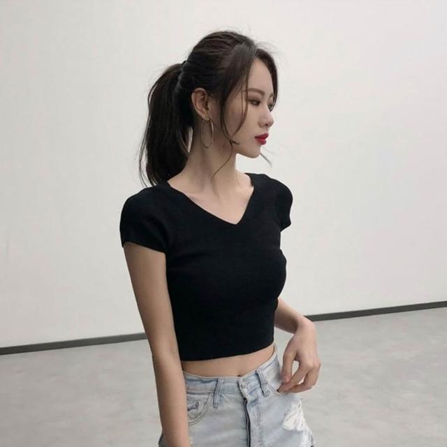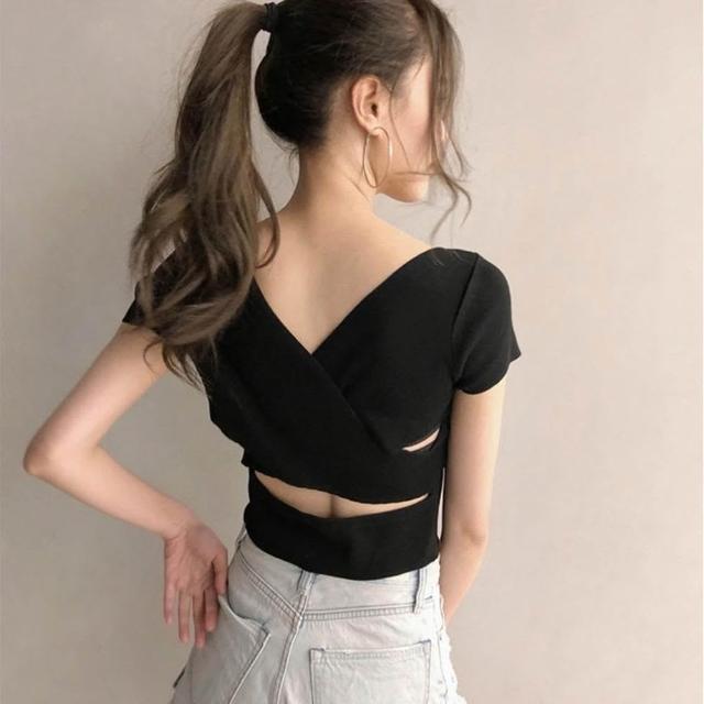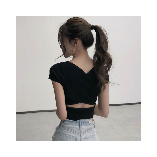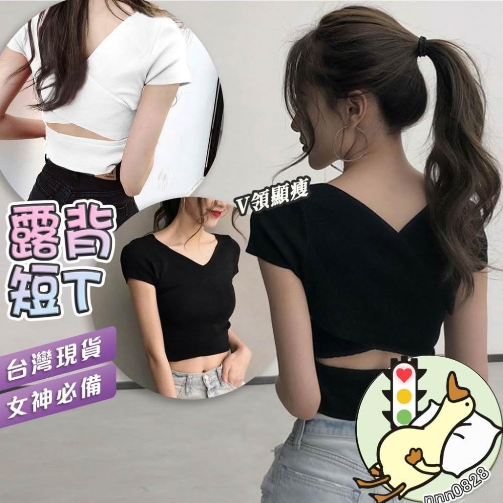 露背V領上衣女裝 V領 短版上衣 露背 露腰 小性感 鏤空 女短T 交叉 短袖 緊身 短款 上衣