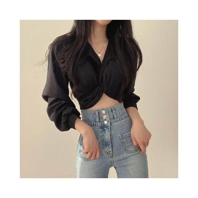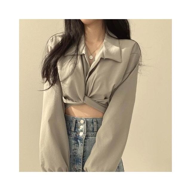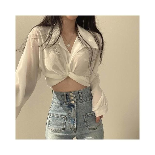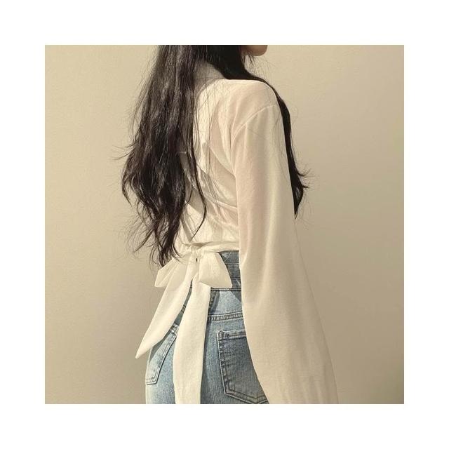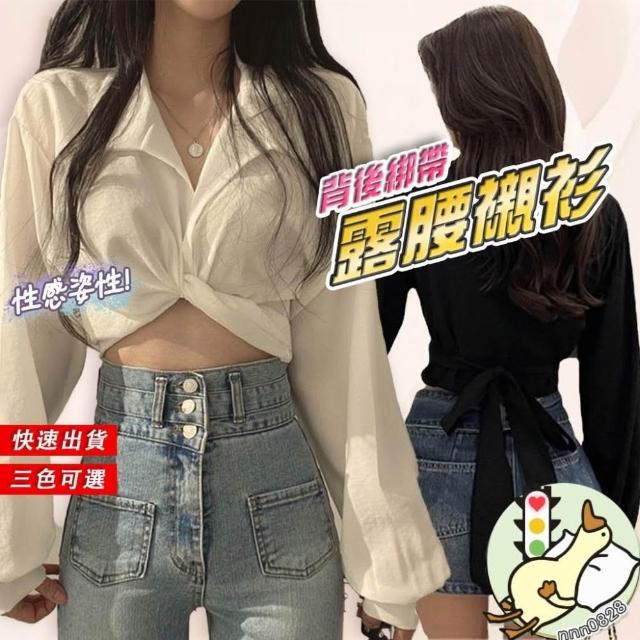 小蘭優購 雪紡襯衫 後背蝴蝶結 韓版襯衫 短版襯衫 短版 露臍 夏季女襯衫 性感襯衫 御姐范 超薄長袖 素色襯衫 女裝