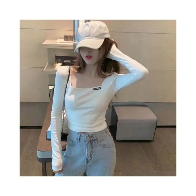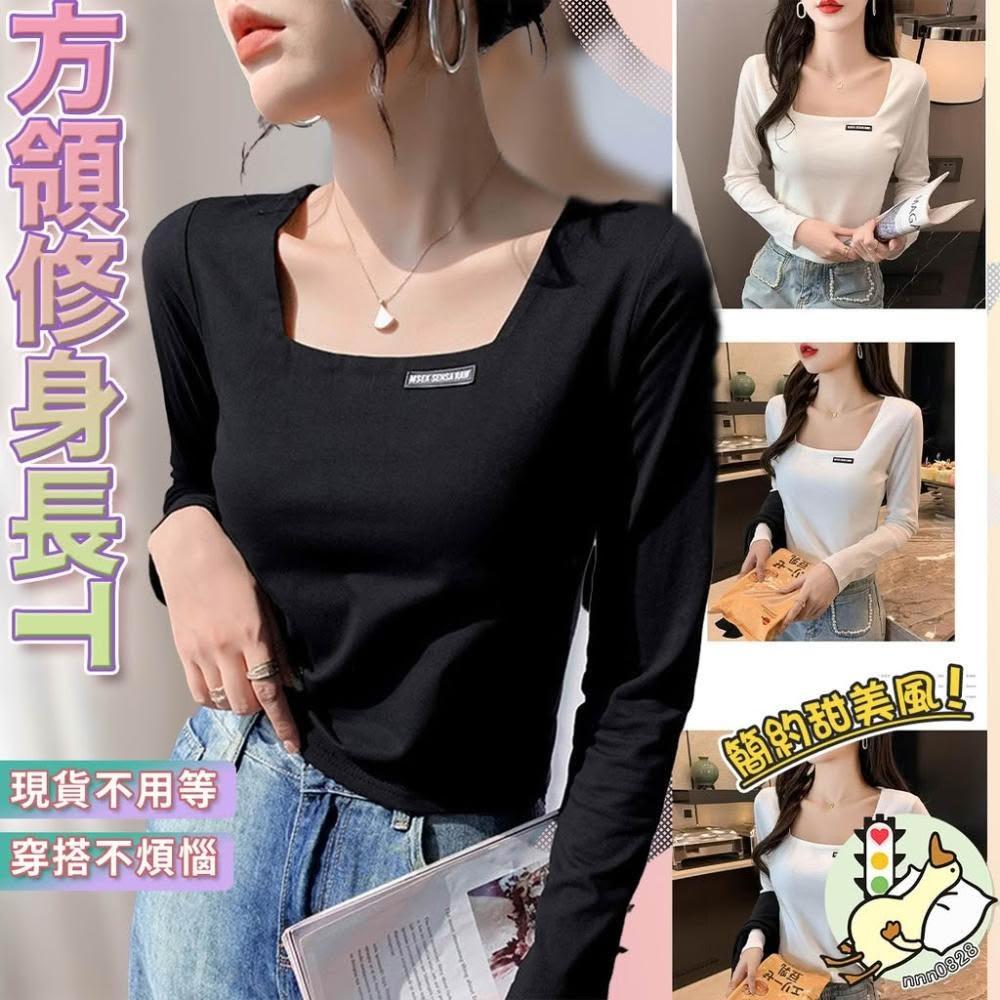 小蘭優購 韓版上衣 方領長袖 短版上衣 長袖上衣 女裝 衣服 修身上衣 顯瘦上衣 長袖t恤 秋天長袖 秋天衣服 女上衣