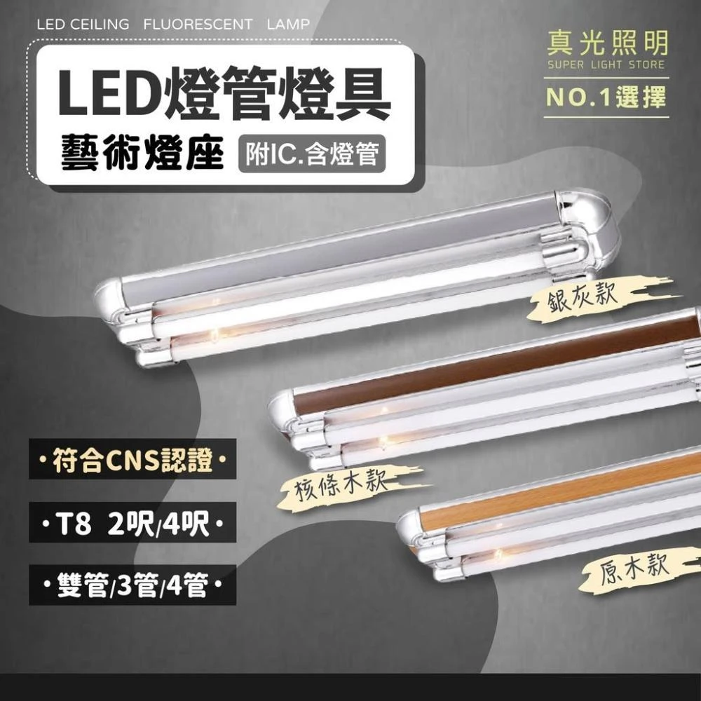 T8 2呎 燈座 藝術燈座 雙管 3管 4管 附IC 含燈管 核桃木 原木 銀灰