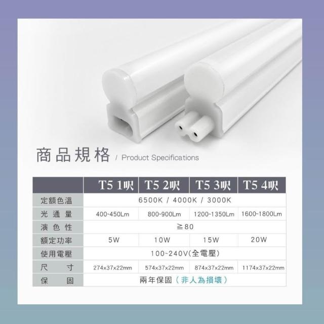 T5 1呎 一體式支架燈 LED燈管 燈管 白光 黃光 自然光 4000K 兩年保固