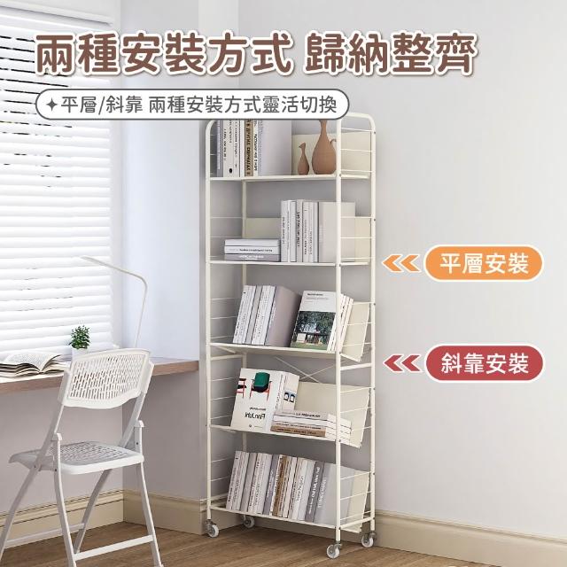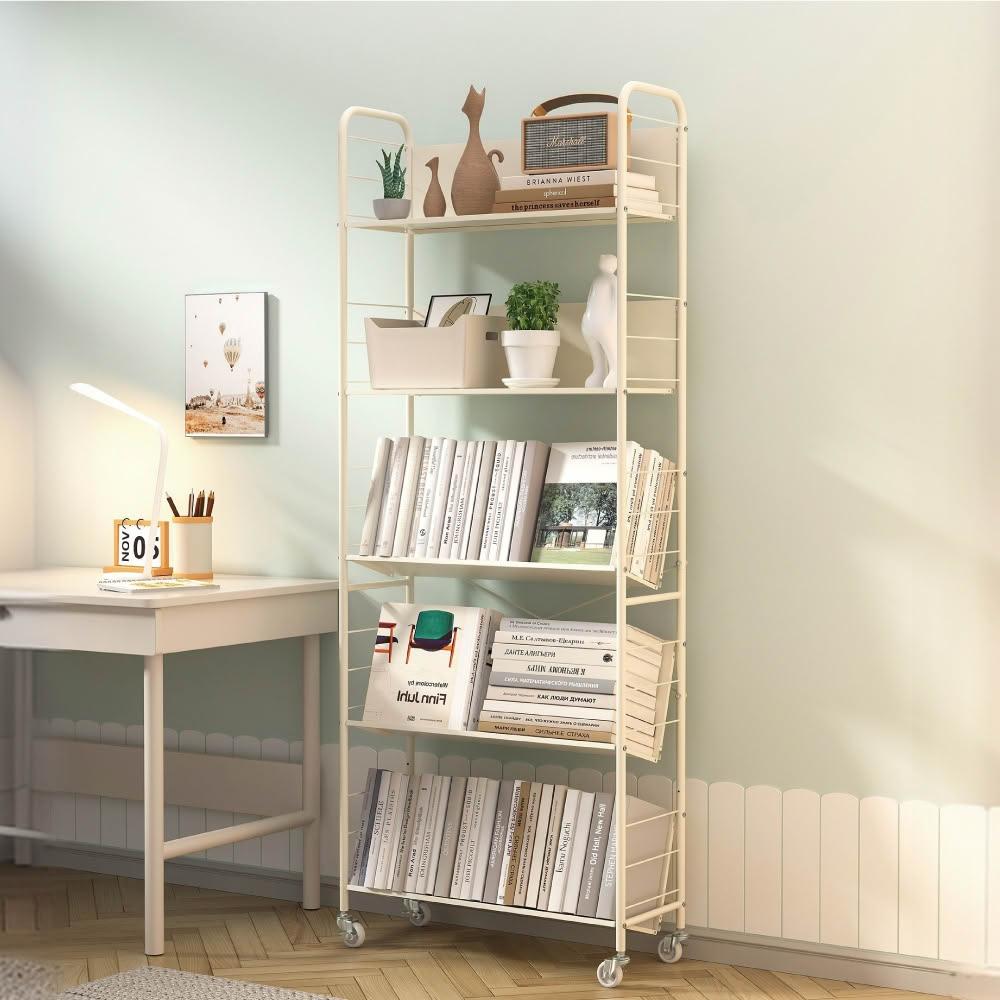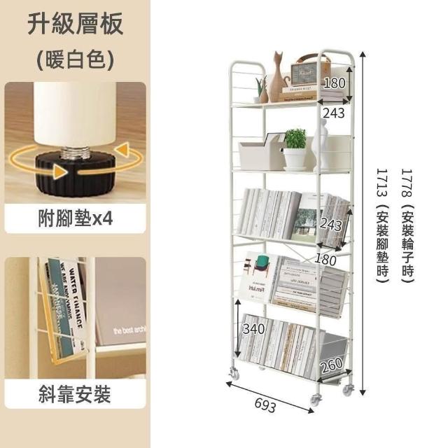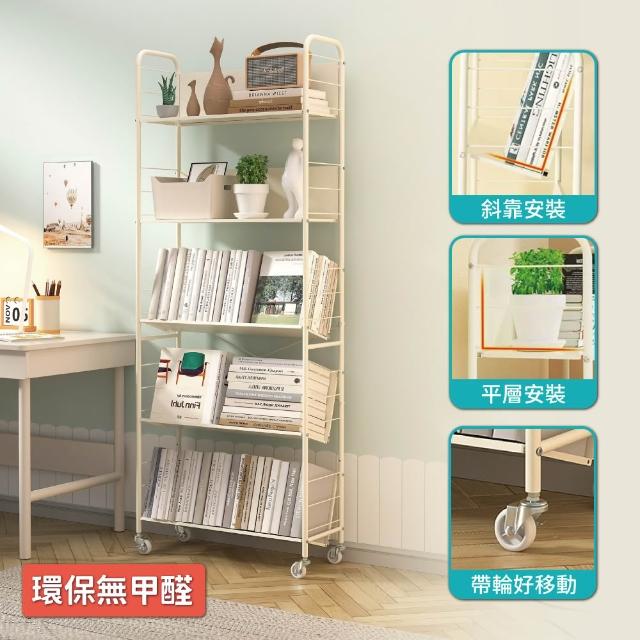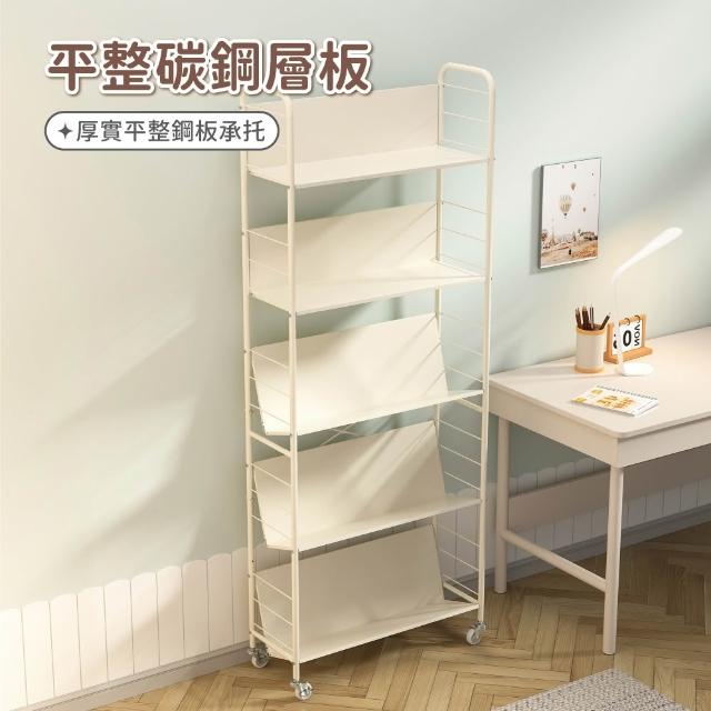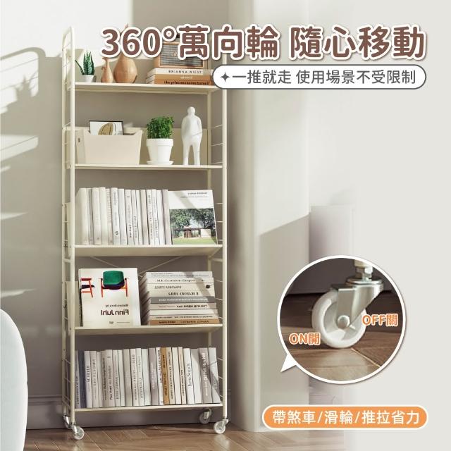 慢慢家居升級層板-奶油風超穩固可移動鐵藝五層書架(文件推車 兒童書架 移動書櫃 置物架)