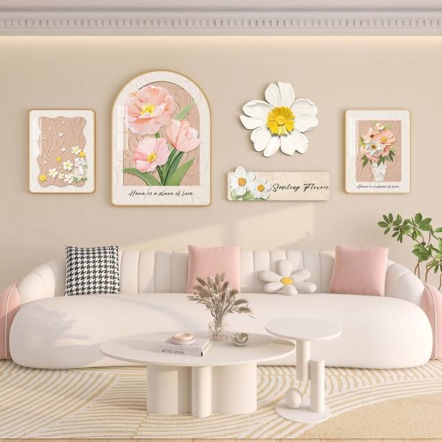 奶油風客廳掛畫北歐沙發背景墻裝飾畫高級感大氣花卉綠植壁畫組合