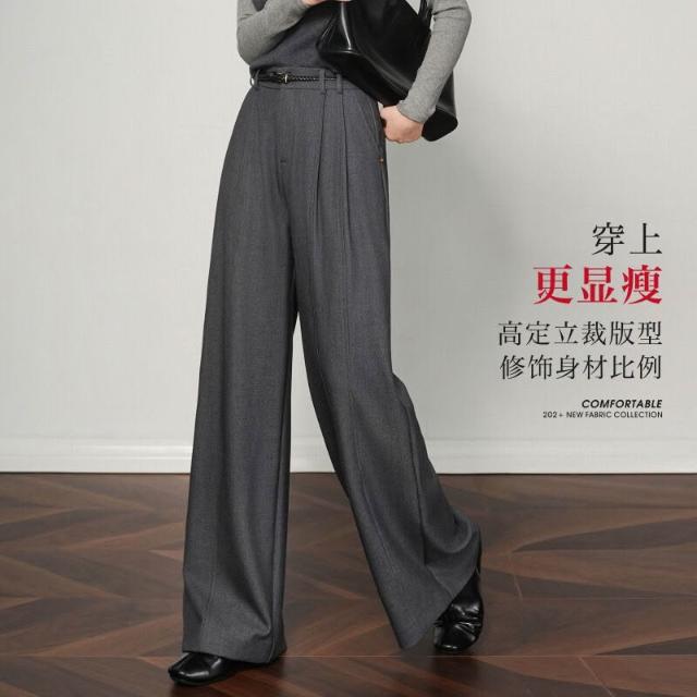 天絲羊毛灰色闊腿褲女2025新款高腰垂墜感寬松休閑窄版直筒西裝褲