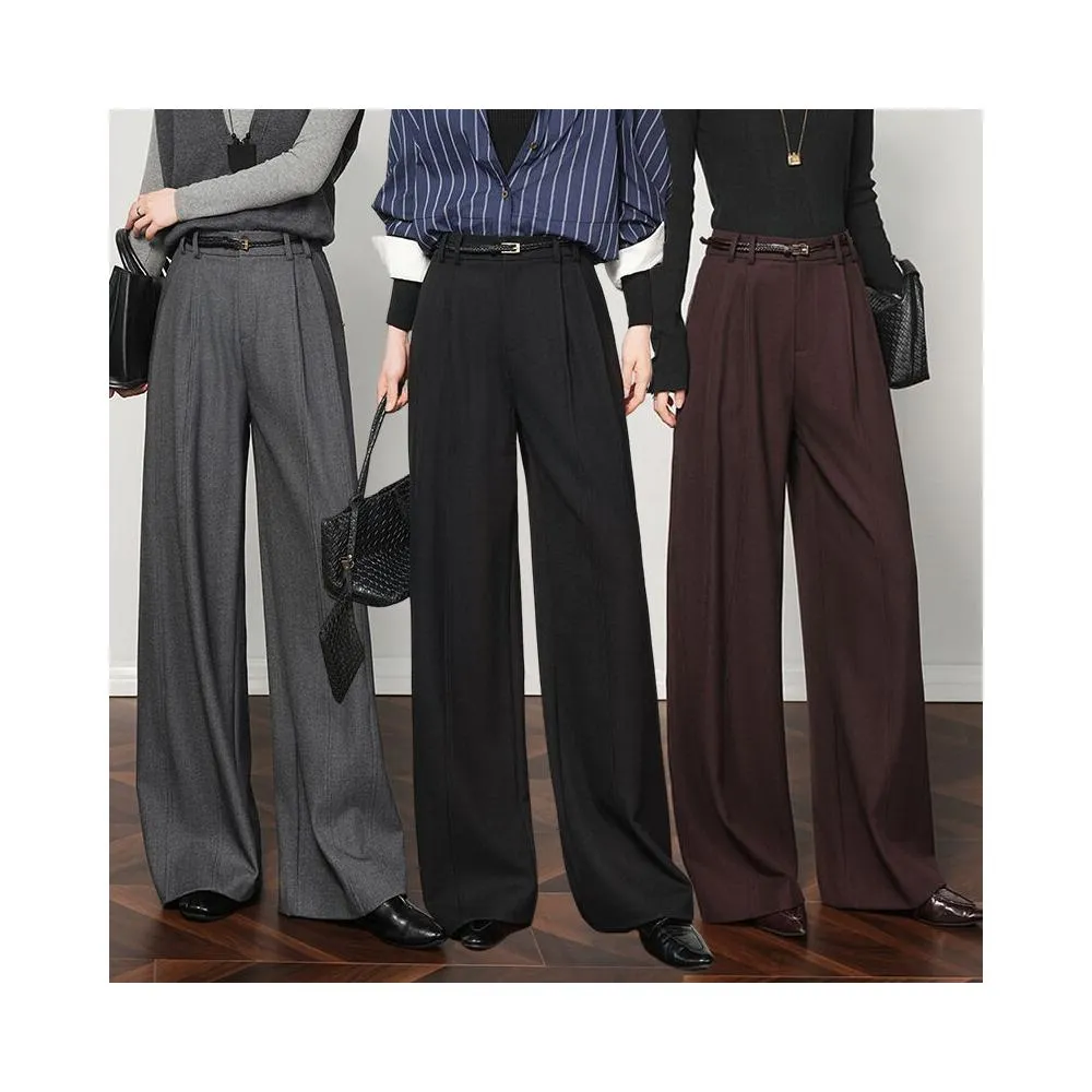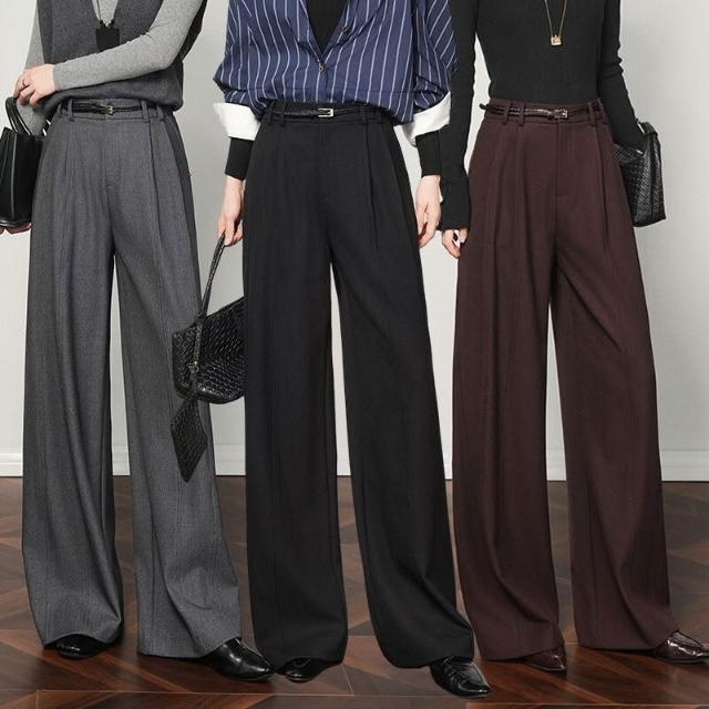 天絲羊毛灰色闊腿褲女2025新款高腰垂墜感寬松休閑窄版直筒西裝褲