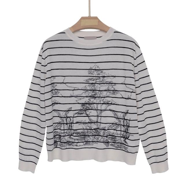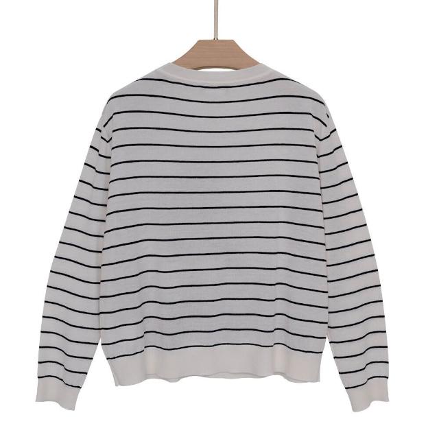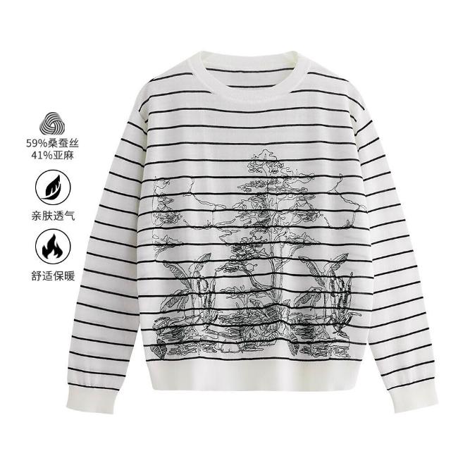 打底衫 上衣 暖巢 熱銷爆款秋季新品桑蠶絲女裝撞色長袖圓領條紋圖案針織打底衫上衣