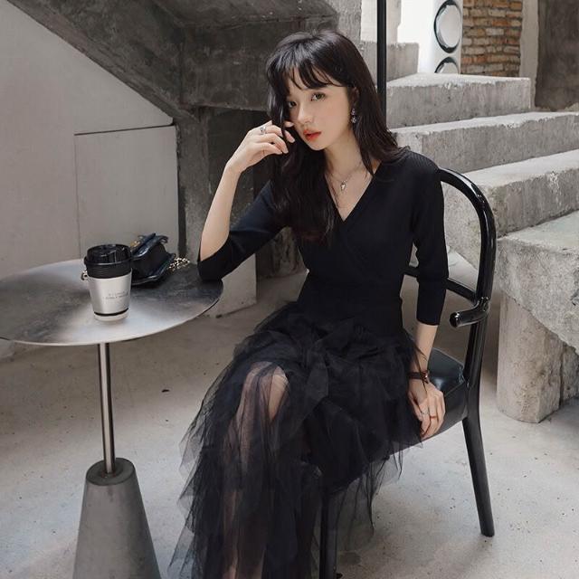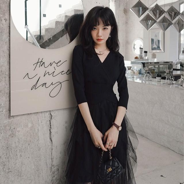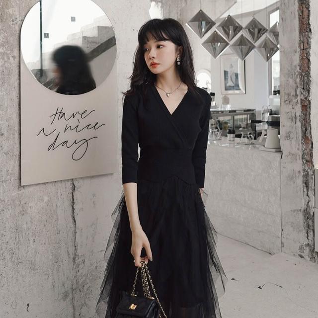 暖巢 實拍黑色紗裙連衣裙女2025春秋新款法式高級感赫本風顯瘦v領長裙 連衣裙 全身裙