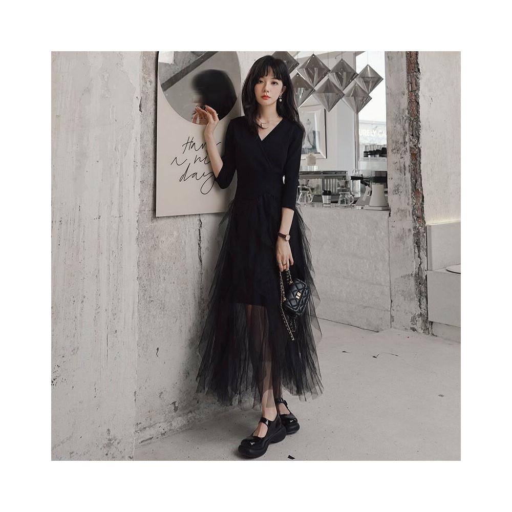暖巢 實拍黑色紗裙連衣裙女2025春秋新款法式高級感赫本風顯瘦v領長裙 連衣裙 全身裙