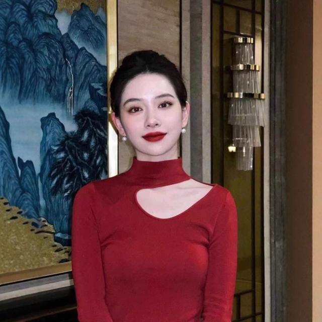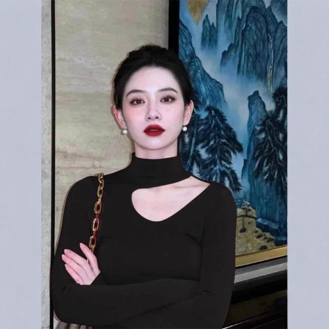 黑色镂空半高領掛脖內搭打底衫女秋冬純欲修身針織衫鎖骨上衣秋季 上衣 T恤