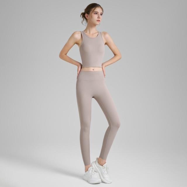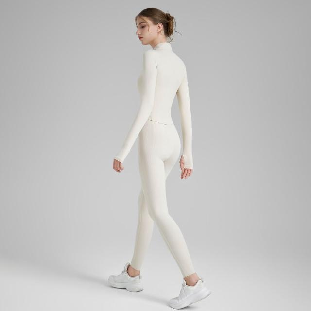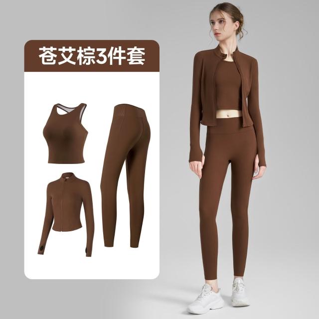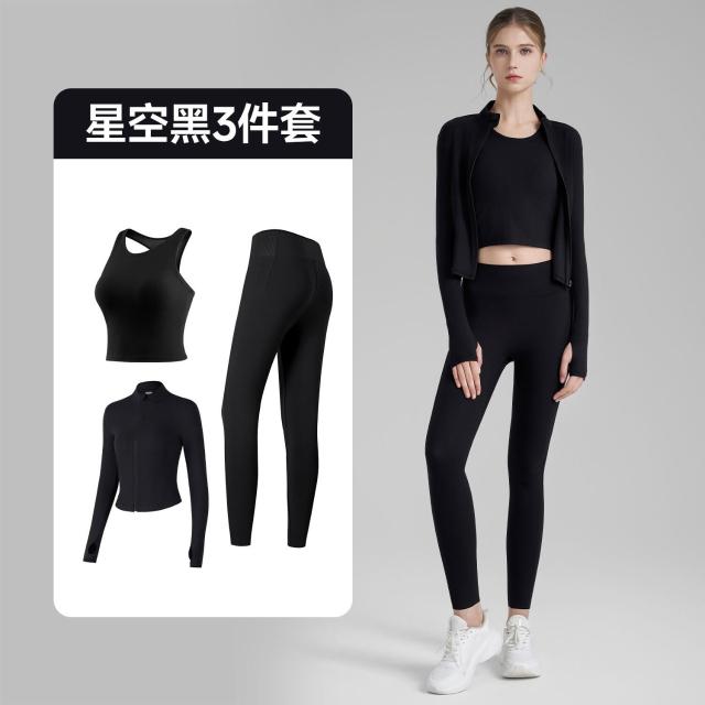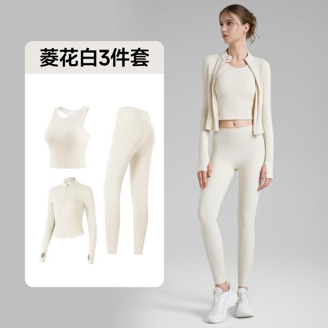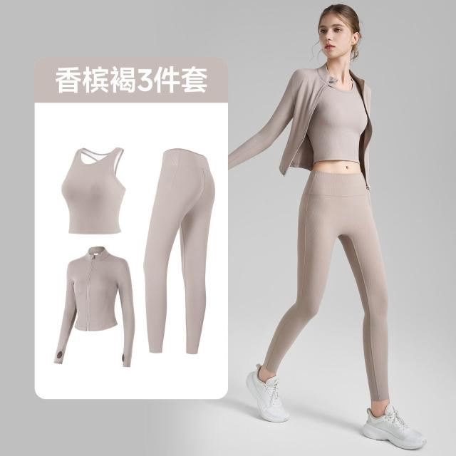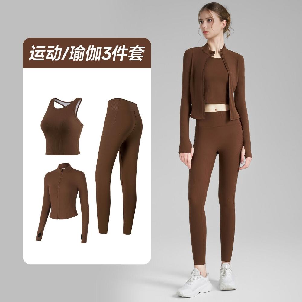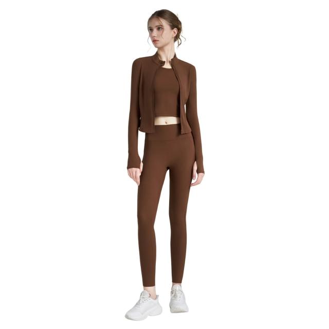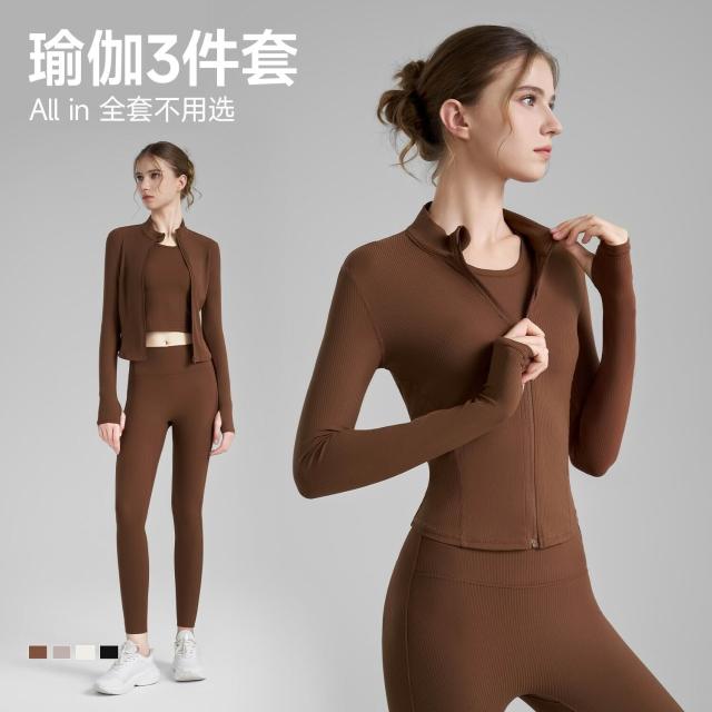 羅紋瑜伽套裝三件套女緊身瑜伽褲立領指套瑜伽外套固定杯瑜伽背心 運動套裝 上衣 褲子