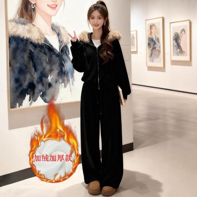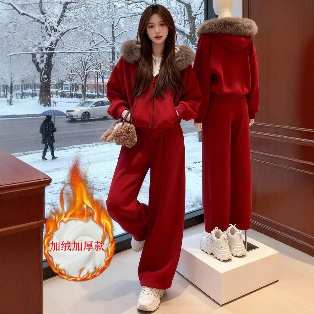 休閑運動套裝女秋冬季巨好看紅色加絨連帽衛衣外套闊腿褲子一整套 運動套裝 上衣 褲子