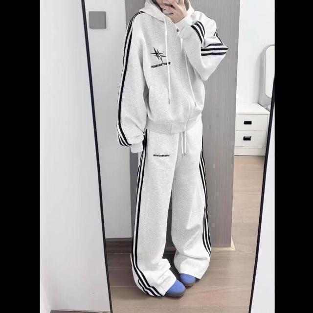 美式高街運動服套裝女春秋季跑步時尚寬松韓版學生衛衣休閑兩件套 運動套裝 上衣 褲子