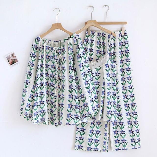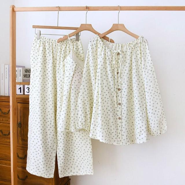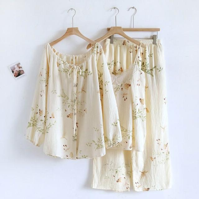 新款純棉绉布三件套睡衣女長袖開衫吊帶蕾絲花邊甜美風家居服套裝 兩件式睡衣