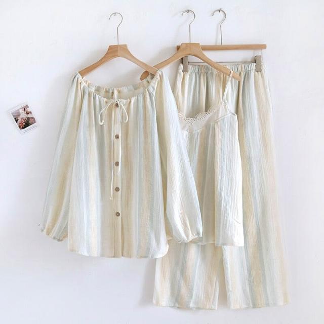 新款純棉绉布三件套睡衣女長袖開衫吊帶蕾絲花邊甜美風家居服套裝 兩件式睡衣