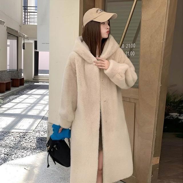 台灣熱銷 進口紫標天鵝絨貂皮大衣女整貂連帽中長款大碼仿水貂皮草外套顯瘦