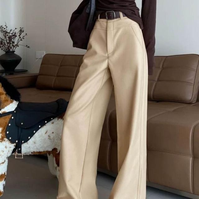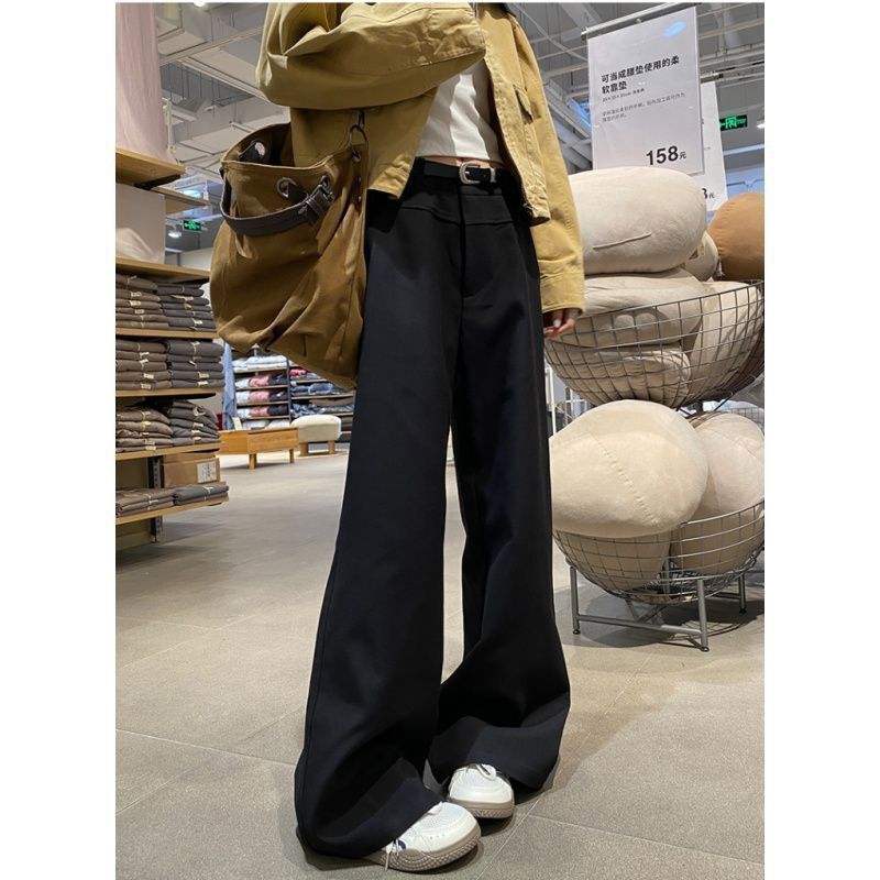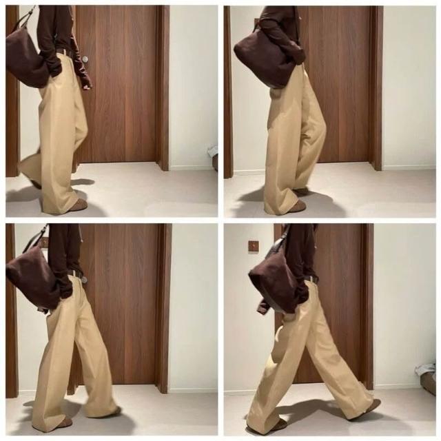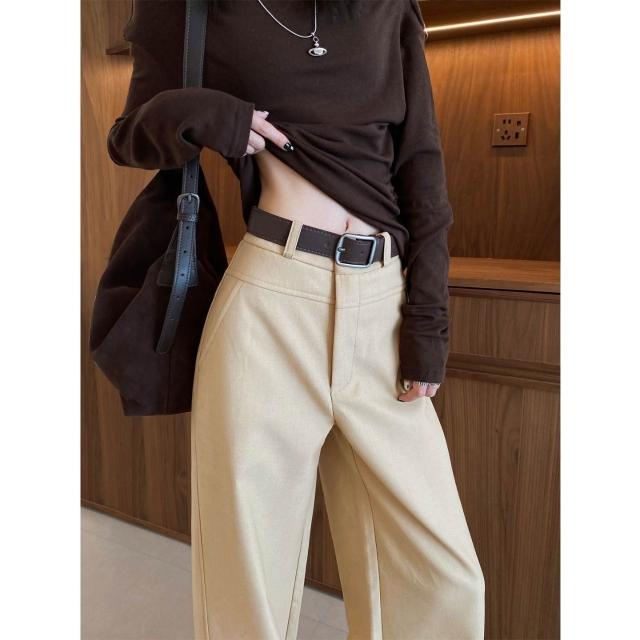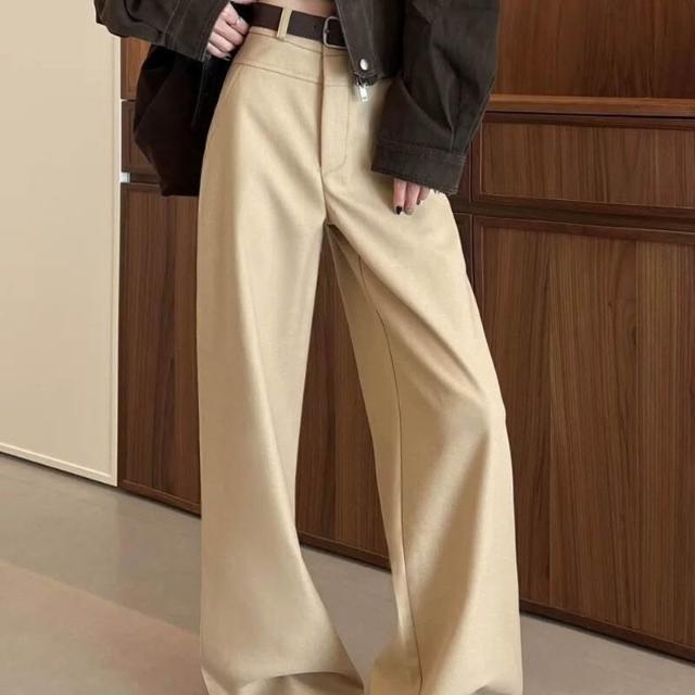 暖巢 卡其色闊腿褲女春秋季新款高腰垂感窄版顯瘦西裝褲休閑直筒褲