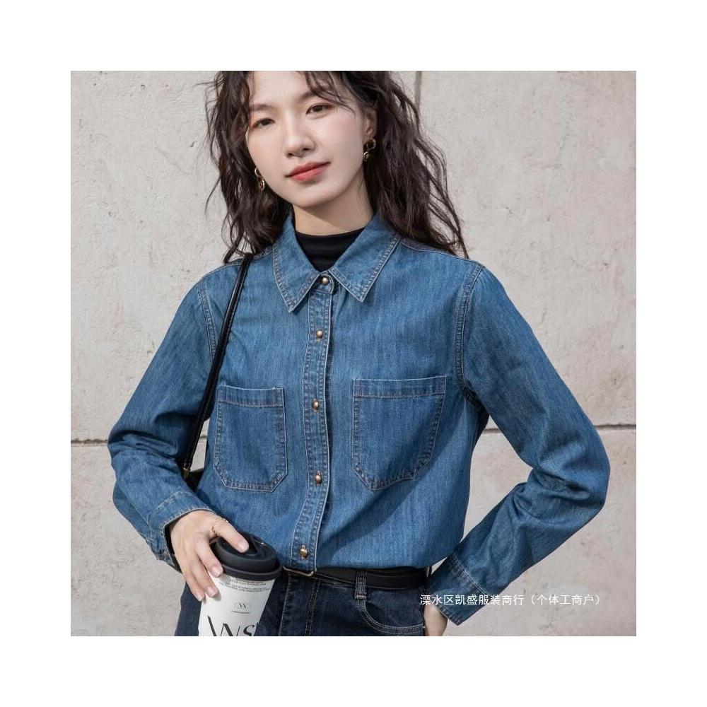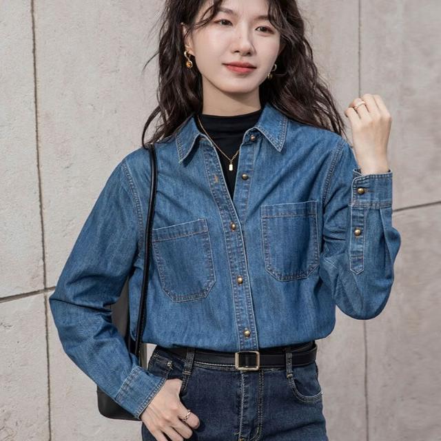 暖巢 深藍色復古牛仔襯衫女內搭疊穿港風 24年新款春裝小個子加絨上衣 春秋上衣