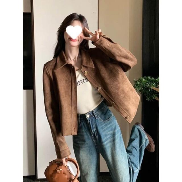 咖色鹿皮絨短款外套女春秋新款韓系美拉德復古小個子休閑夾克上衣 春秋外套
