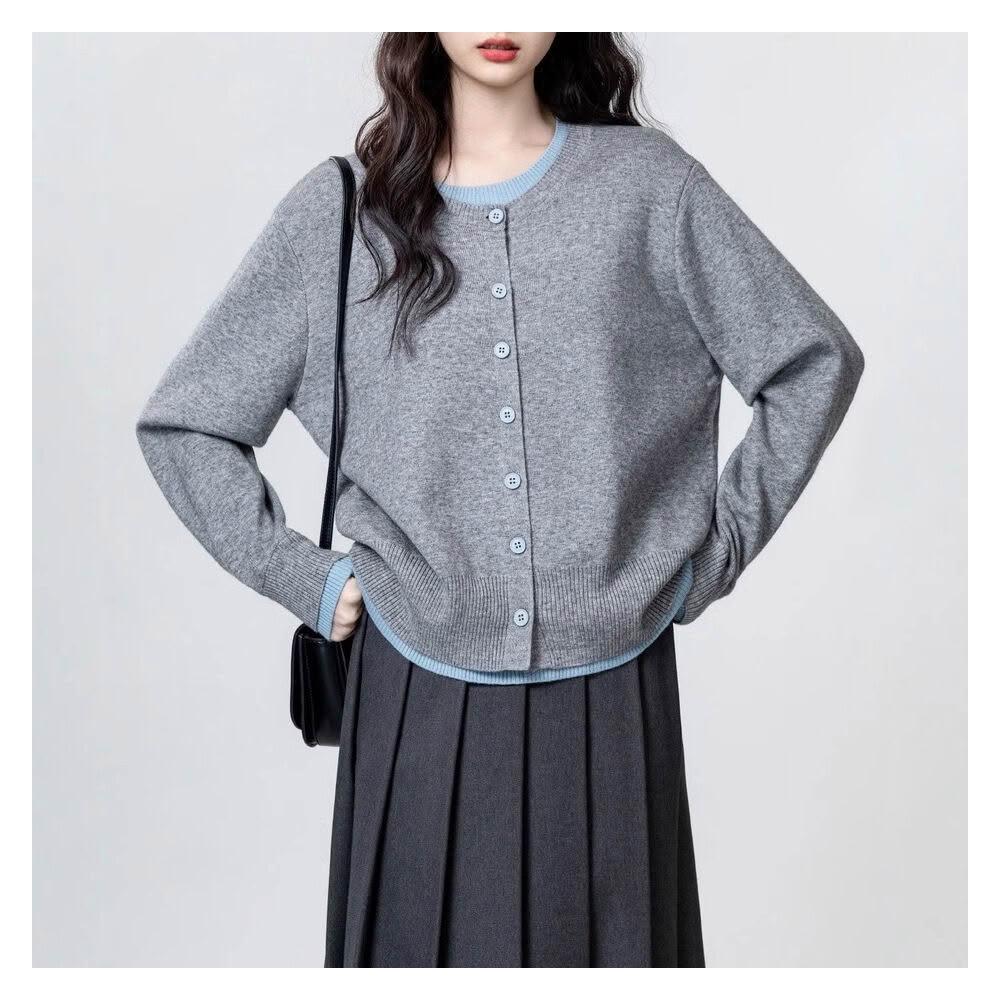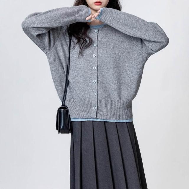 灰色假兩件長袖針織衫女春秋新款設計感寬松撞色毛衣別致上衣