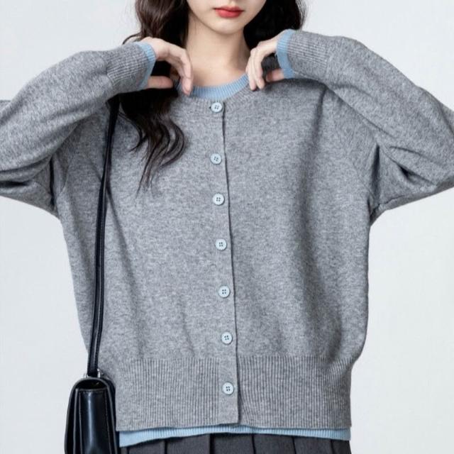 灰色假兩件長袖針織衫女春秋新款設計感寬松撞色毛衣別致上衣