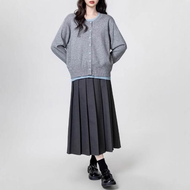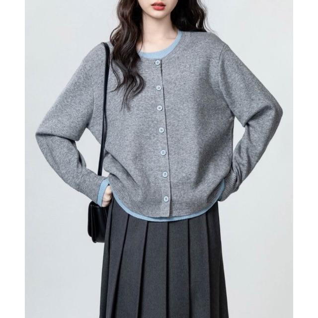 灰色假兩件長袖針織衫女春秋新款設計感寬松撞色毛衣別致上衣