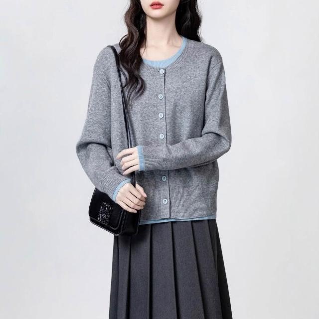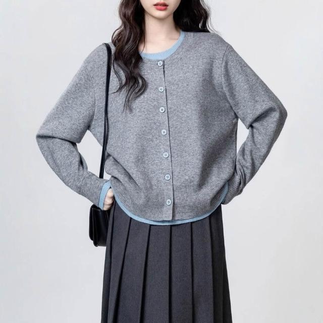 灰色假兩件長袖針織衫女春秋新款設計感寬松撞色毛衣別致上衣