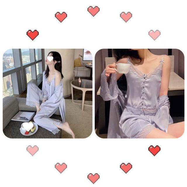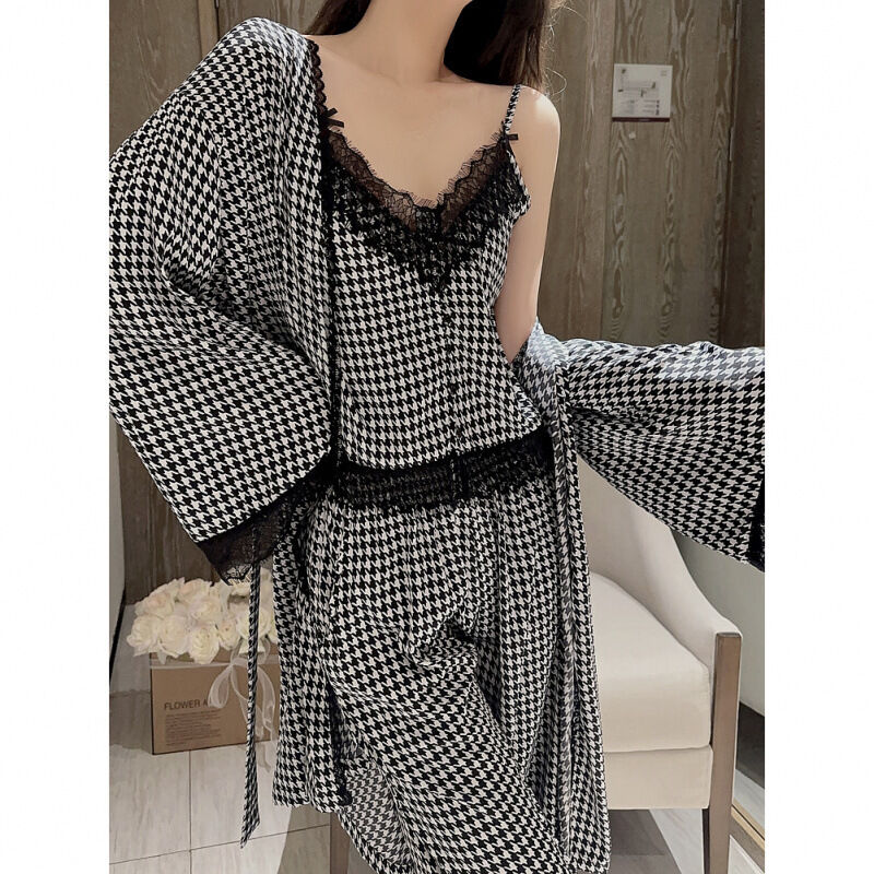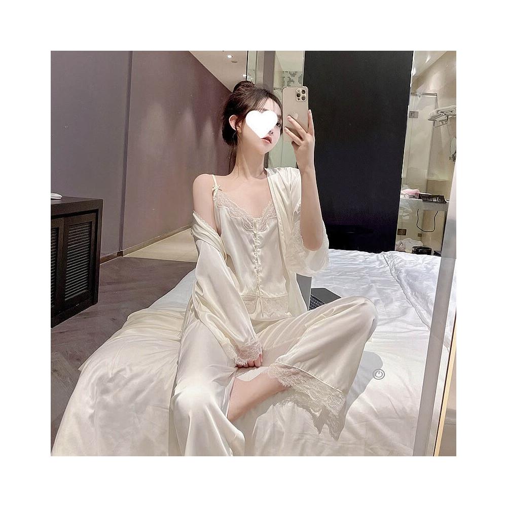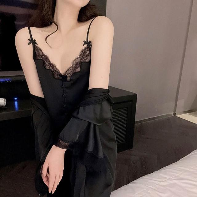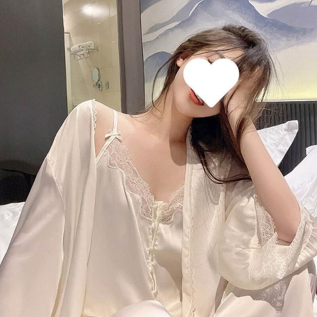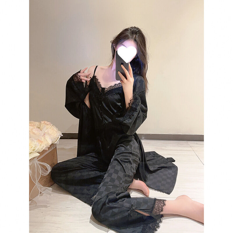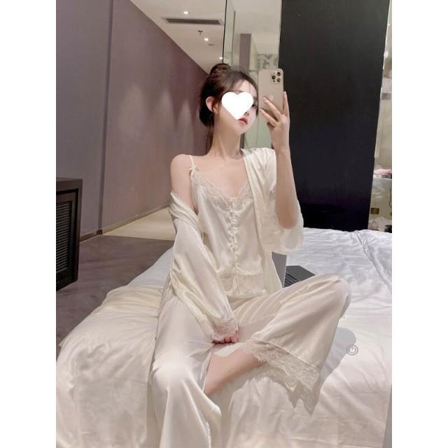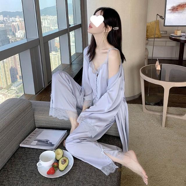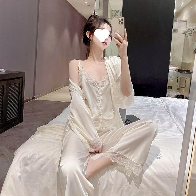 蕾絲吊帶睡衣女夏季性感冰絲純欲高級感真絲家居服三件套睡袍春秋