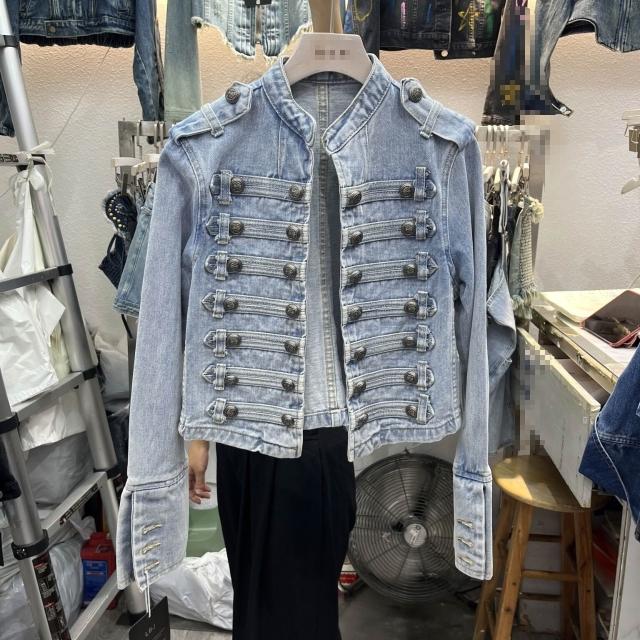 歐貨復古宮廷風排扣裝飾長袖上衣春秋季時尚立領牛仔短外套