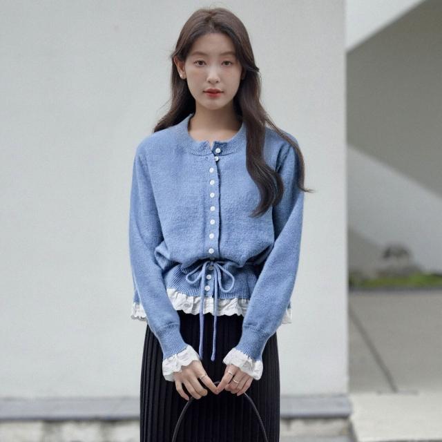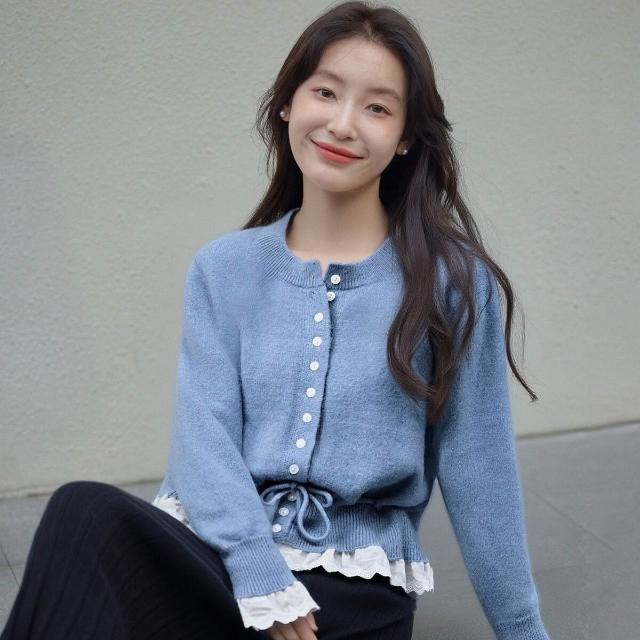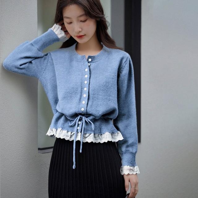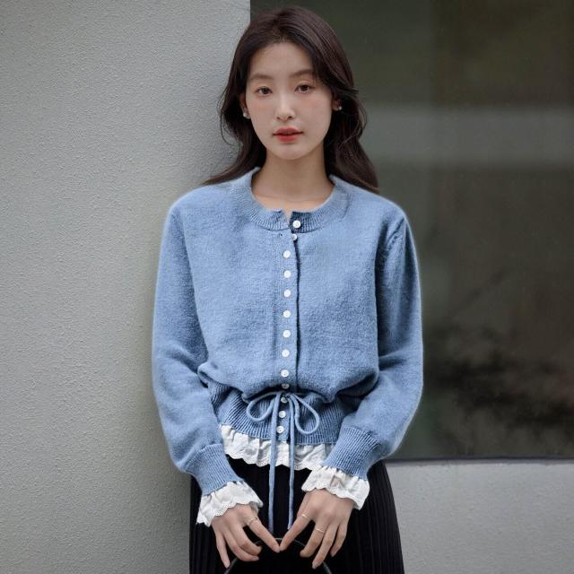 巨好看的早春毛針織衫女2026新款圓領開衫蕾絲花邊韓系上衣