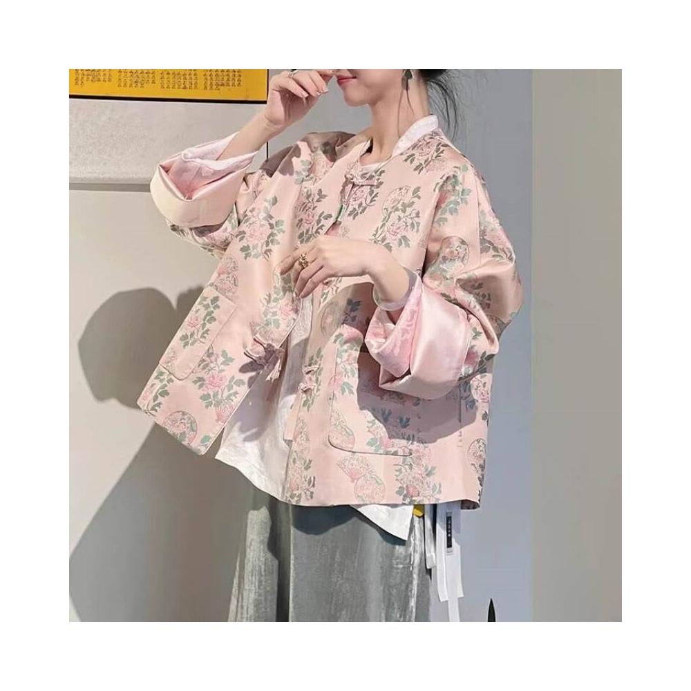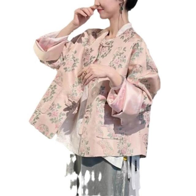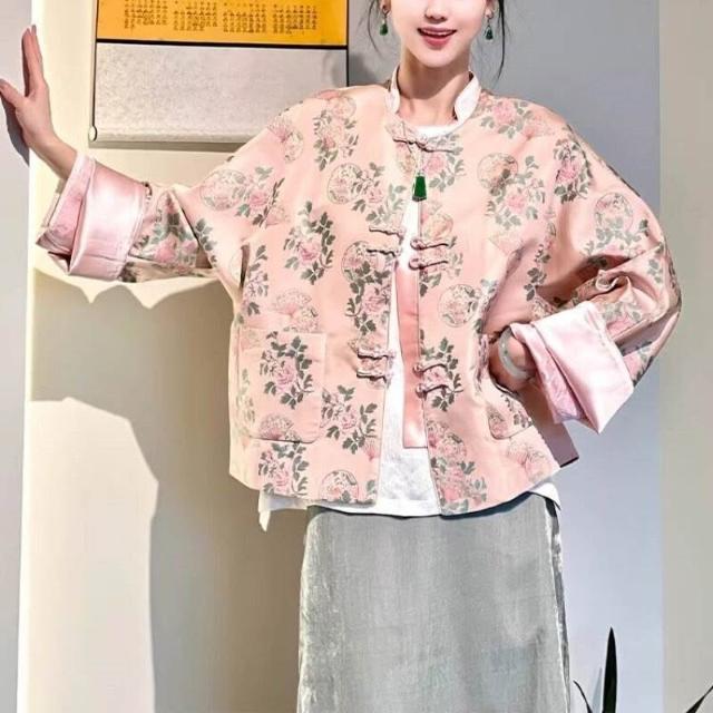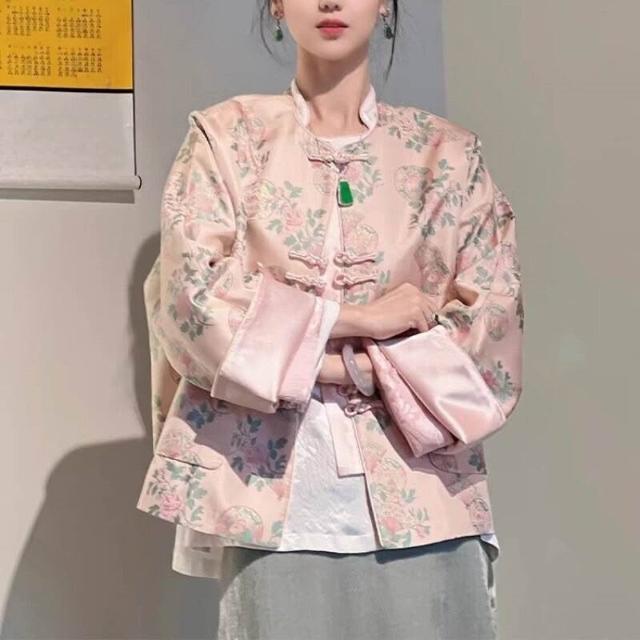 新中式 新中式女裝國風宋錦上衣春秋新款設計感氣質盤扣粉色提花外套