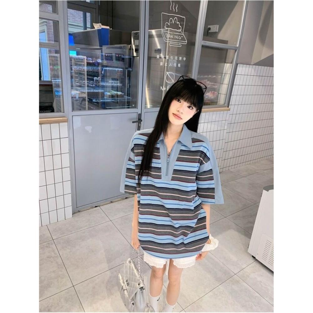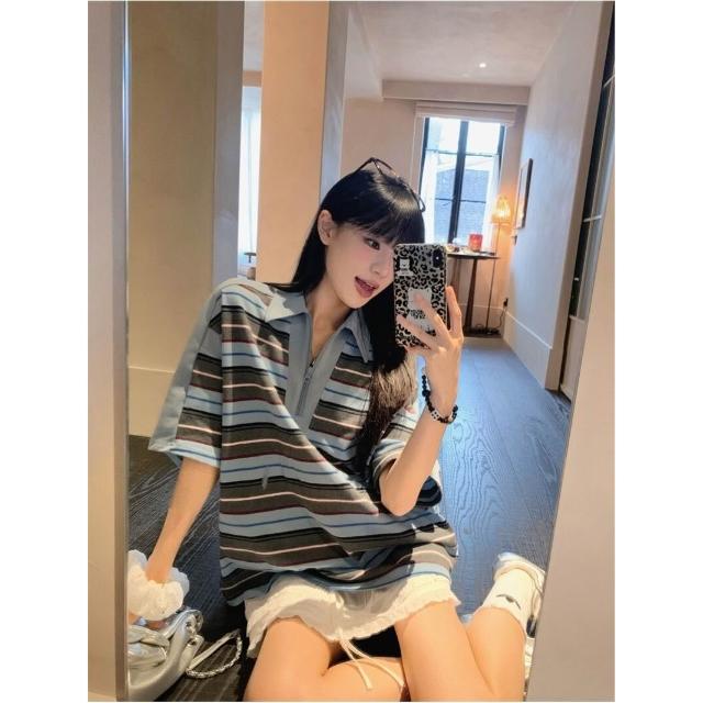 慵懶風POLO領寬松短袖T恤女裝夏季小眾百搭撞色條紋學院風上衣潮