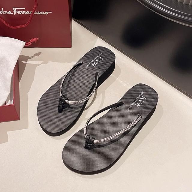 拖鞋系列 海邊新款沙灘鞋拖鞋女夏時尚外穿水鉆人字拖中跟厚底坡跟夾腳涼拖