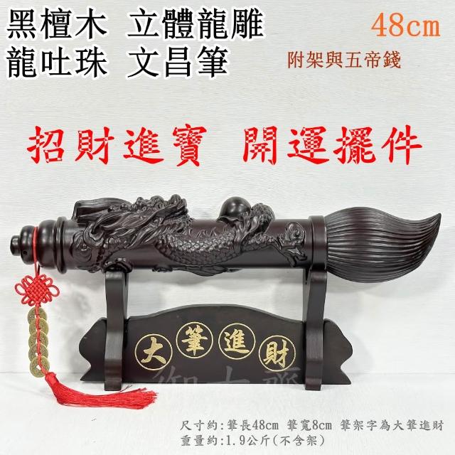 御古齋黑檀木 立體龍雕 龍吐珠 文昌筆 48cm 大筆進財 開運擺件 附座 五帝錢 1102