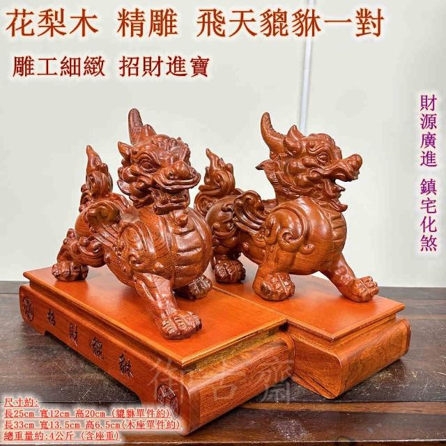 御古齋花梨木 精雕 飛天貔貅一對 雕工細緻 招財進寶 財源廣進 鎮宅化煞 風水開運擺件 附座 0321
