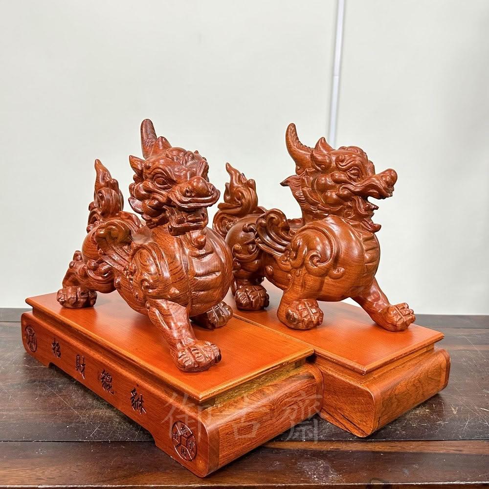 御古齋花梨木 精雕 飛天貔貅一對 雕工細緻 招財進寶 財源廣進 鎮宅化煞 風水開運擺件 附座 0321