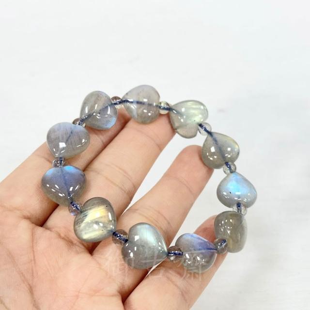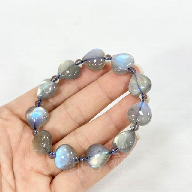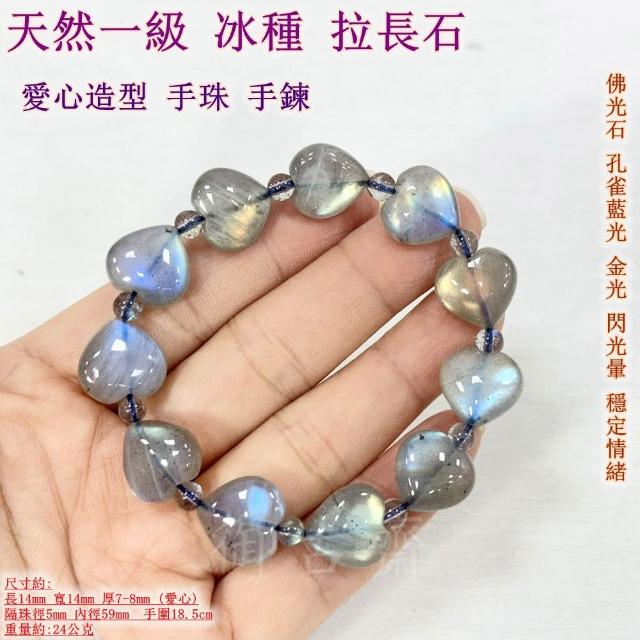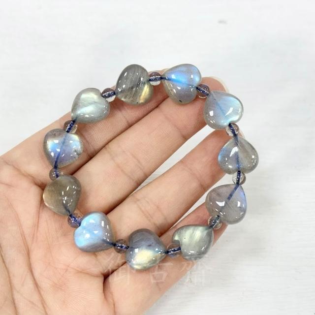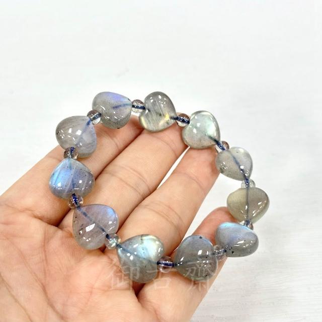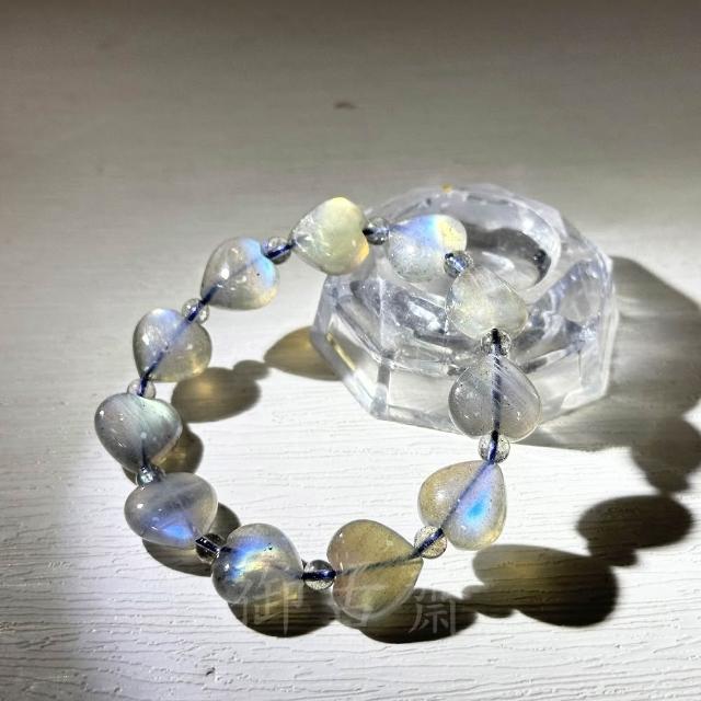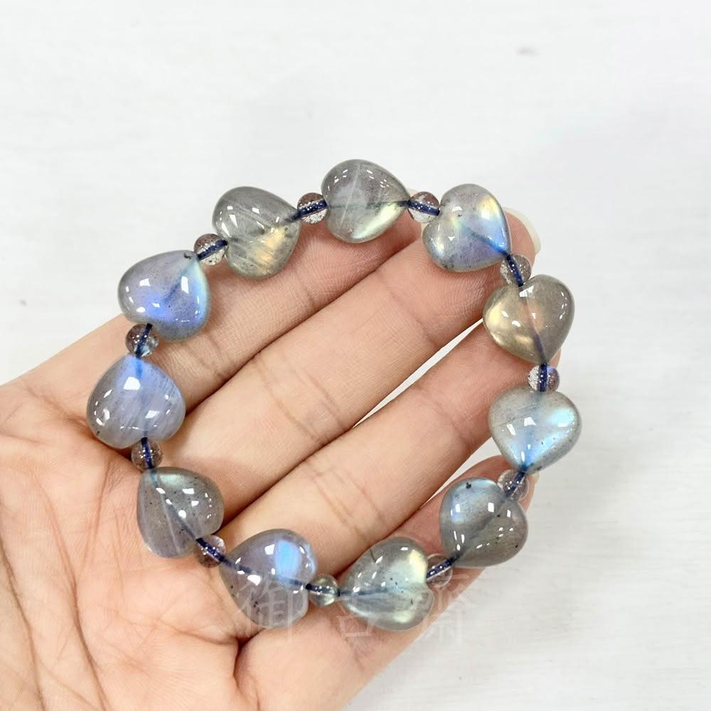 御古齋天然一級 冰種 拉長石 愛心造型 手珠 手鍊 佛光石 孔雀藍光 金光 閃光暈 穩定情緒 121102