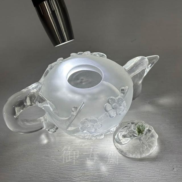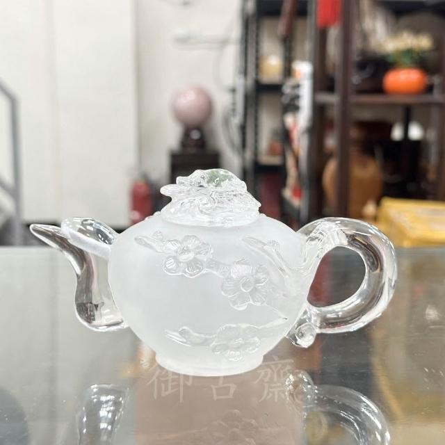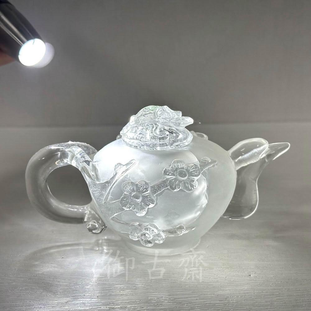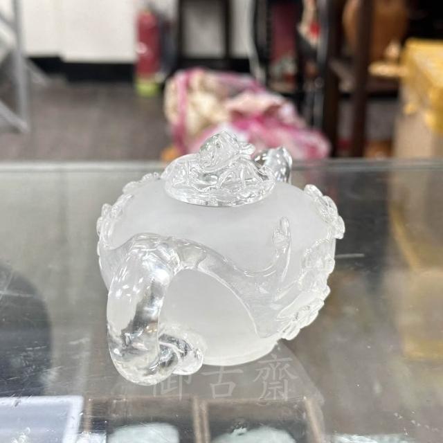 御古齋天然 白水晶 精雕喜上眉稍 咬錢蝙蝠 造型茶壺 天然紋路 擺壺生福 居家擺件 裝飾擺飾 附盒 0903