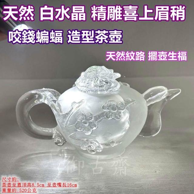 御古齋天然 白水晶 精雕喜上眉稍 咬錢蝙蝠 造型茶壺 天然紋路 擺壺生福 居家擺件 裝飾擺飾 附盒 0903