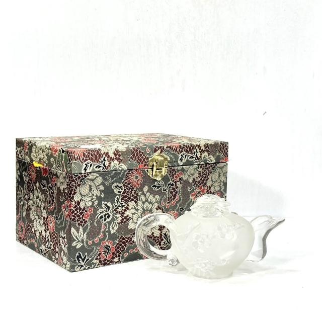 御古齋天然 白水晶 精雕喜上眉稍 咬錢蝙蝠 造型茶壺 天然紋路 擺壺生福 居家擺件 裝飾擺飾 附盒 0903
