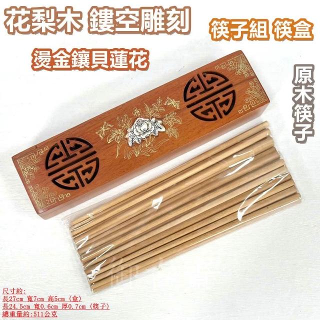御古齋花梨木 鏤空雕刻 燙金鑲貝蓮花 筷子組 筷盒 原木筷子 一組10雙 多用途 線香盒 收納盒 0903