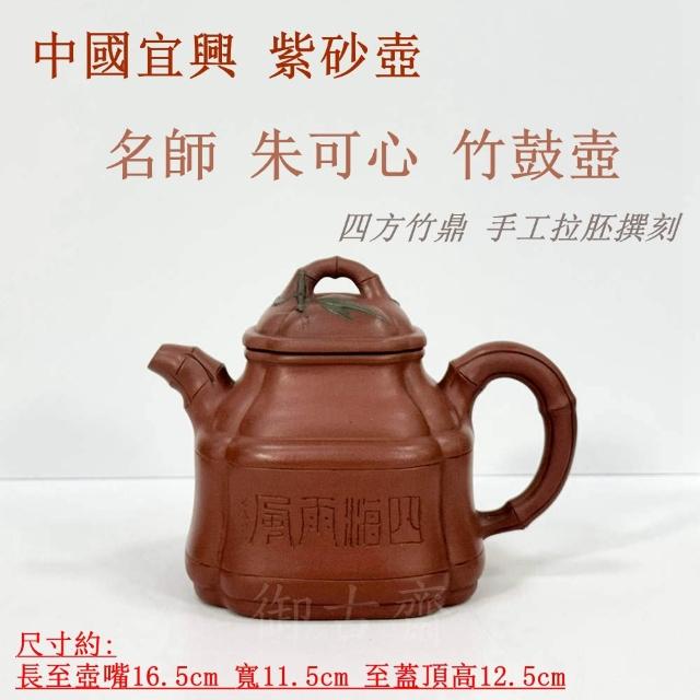 御古齋中國宜興 紫砂壺 名師 朱可心 竹鼓壺 四方竹鼎 名家壺 朱泥壺 茶壺 手工拉胚撰刻 有落款 012801