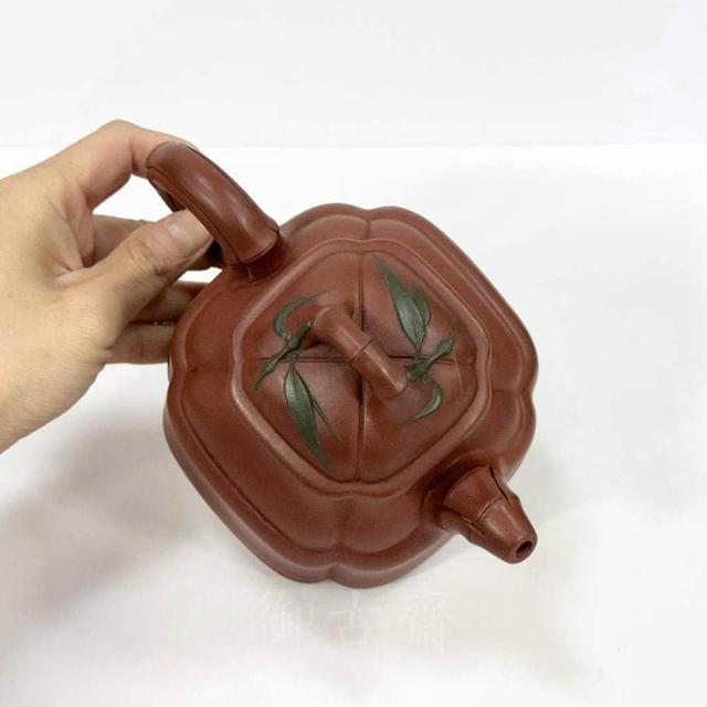 御古齋中國宜興 紫砂壺 名師 朱可心 竹鼓壺 四方竹鼎 名家壺 朱泥壺 茶壺 手工拉胚撰刻 有落款 012801