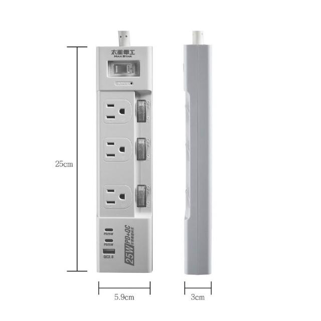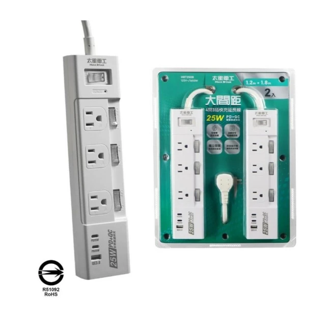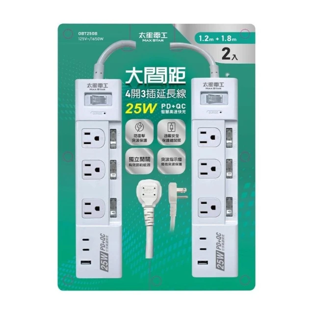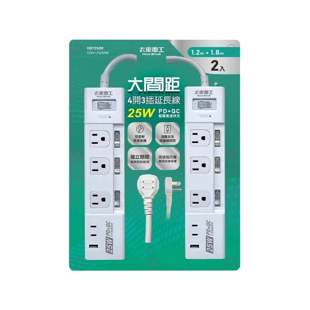 愛的小舖- 太星電工 四開三插快充延長線 15A 1.2公尺 + 1.8公尺 (兩入裝)