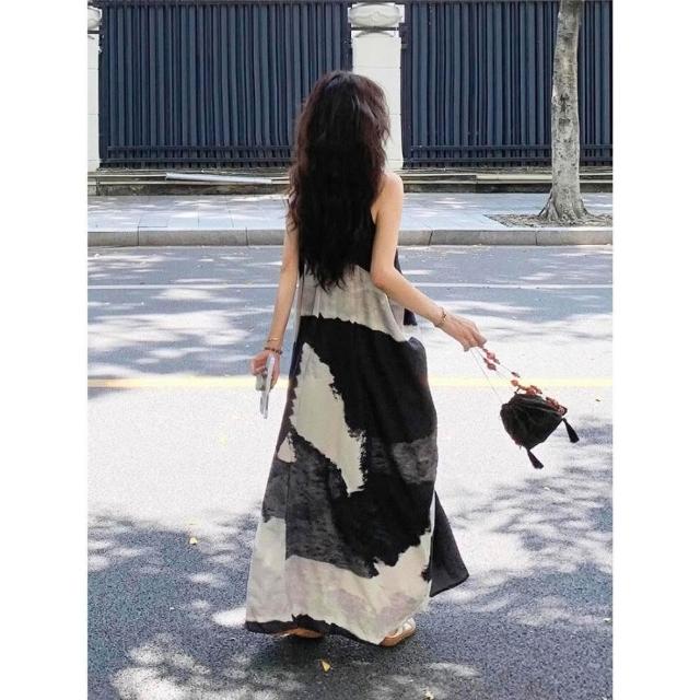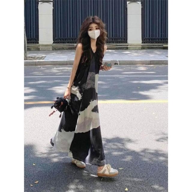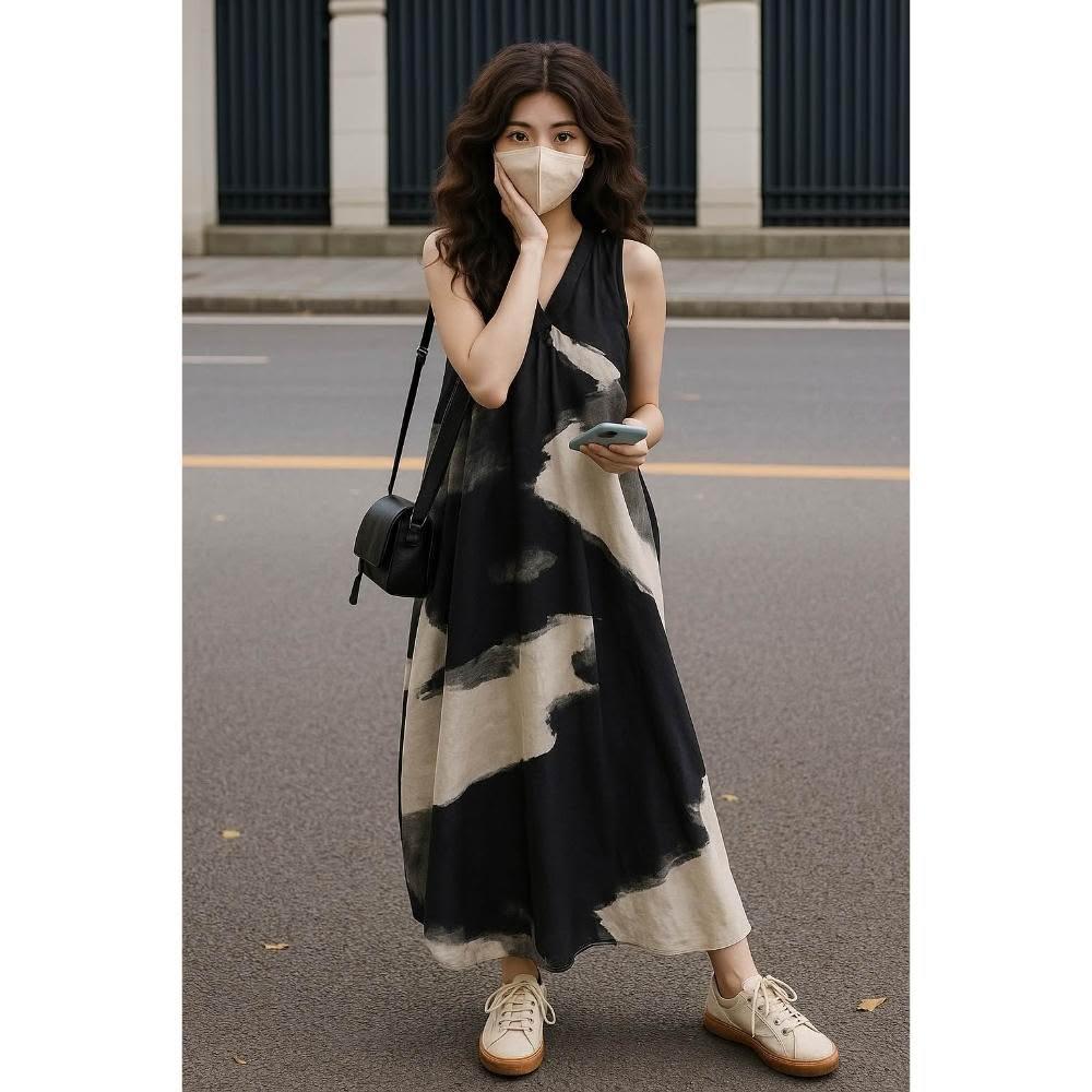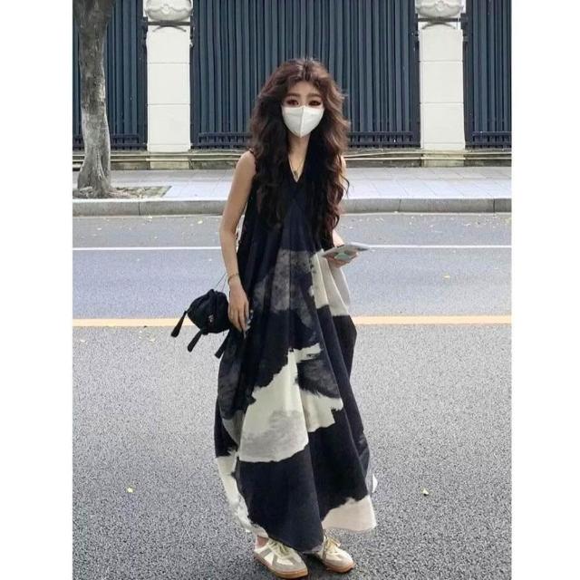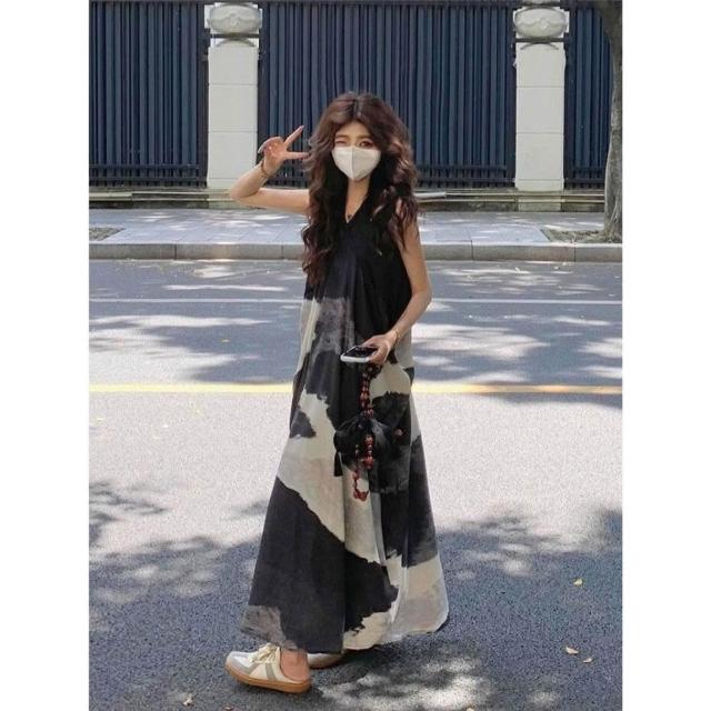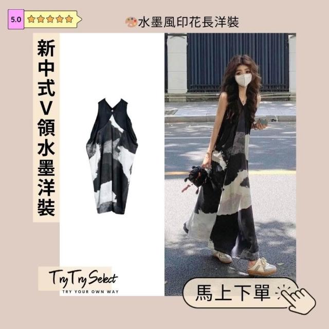 🌸新中式水墨印花V領洋裝|氣質長版背心裙|顯瘦連身裙設計 穿穿trytry