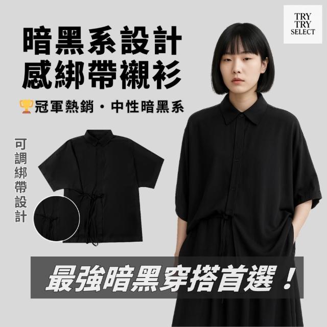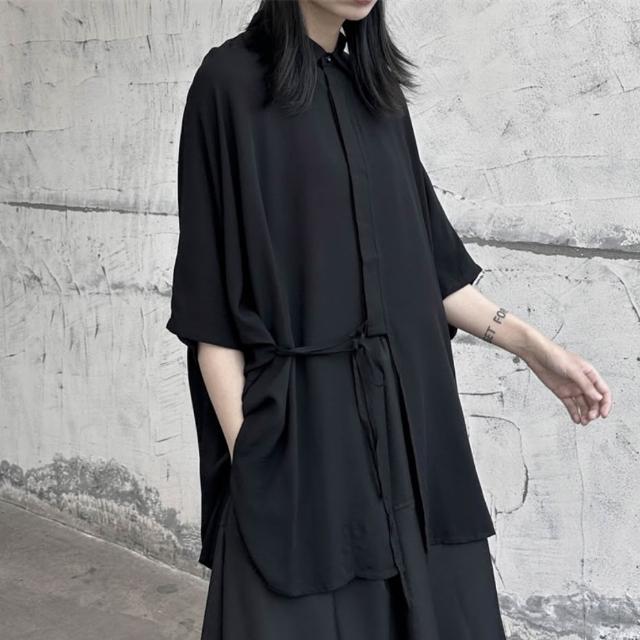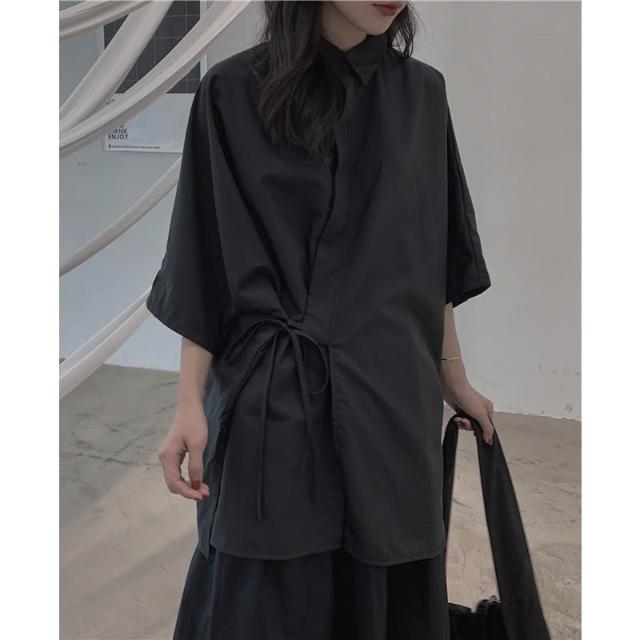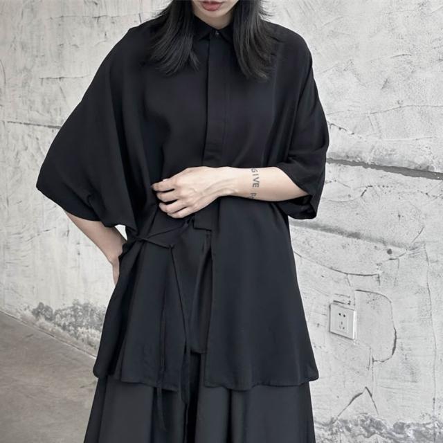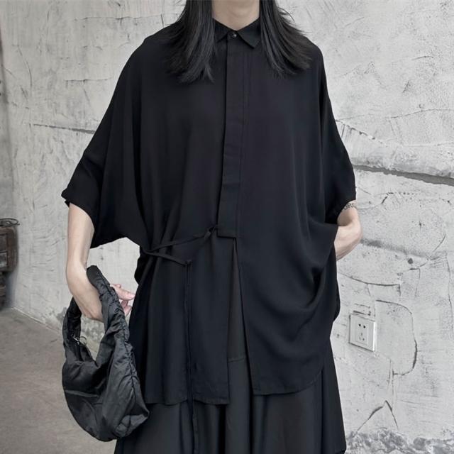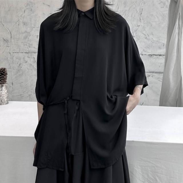 ✦暗黑系設計感短袖綁帶襯衫 中式上衣 寬鬆剪裁日系風【穿穿trytry】