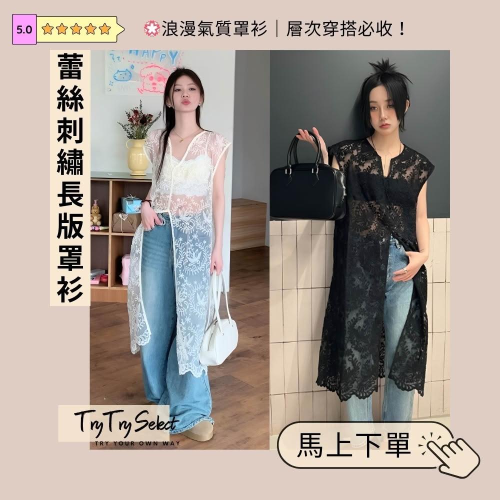 � 蕾絲刺繡透膚洋裝 連身裙 開襟罩衫 背心套裝 疊穿性感穿搭【穿穿trytry